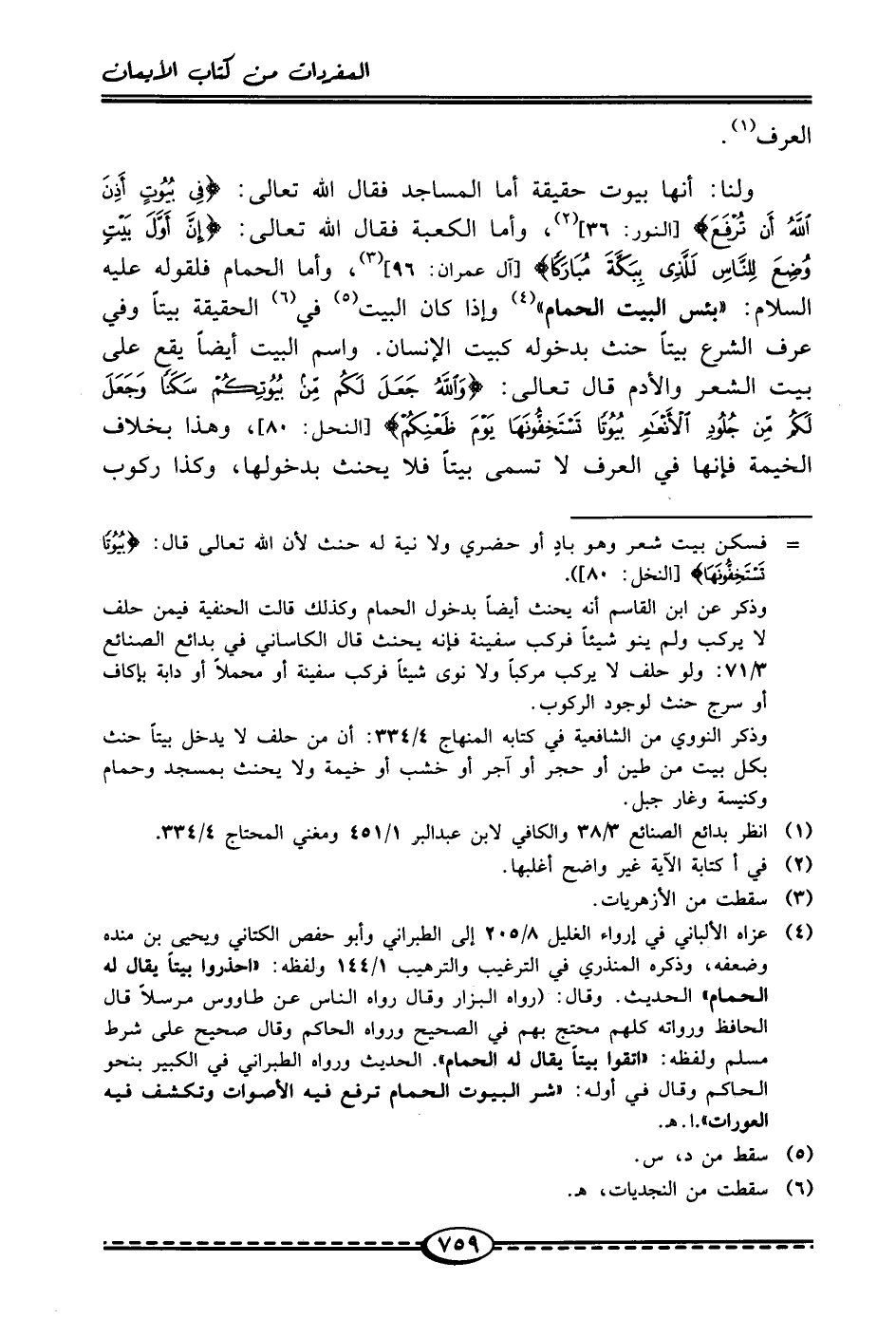 ولنا: أنّها بيوت حقيقة أمّا المساجد فقال الله تعالى: {في بُيُوتٍ أَذِنَ الله أَنْ تُرْفَعَ} [النور: 36]، (¬2)، وأمّا الكعبة فقال الله تعالى: {إِنَّ أَوَّلَ بَيْتٍ وُضِعَ لِلنَّاسِ لَلَّذِي بِبَكَّةَ مُبَارَكًا} [آل عمران: 96]، (¬3)، وأمّا الحمام فلقوله عليه السّلام: "بئس البيت الحمام" (¬4) وإذا كان البيت (¬5) في (¬6) الحقيقة بيتًا وفي عرف الشّرع بيتًا حنث بدخوله كبيت الإنسان. واسم البيت أيضًا يقع على بيت الشعر والأدم قال تعالى: {وَاللهُ جَعَلَ لَكُمْ مِنْ بُيُوتِكُمْ سَكَنًا وَجَعَلَ لَكُمْ مِنْ جُلُودِ الْأَنْعَامِ بُيُوتًا تَسْتَخِفُّونَهَا يَوْمَ ظَعْنِكُمْ} [النحل: 80]، وهذا بخلاف الخيمة فإنها في العرف لا تسمى بيتًا فلا يحنث بدخولها، وكذا ركوب