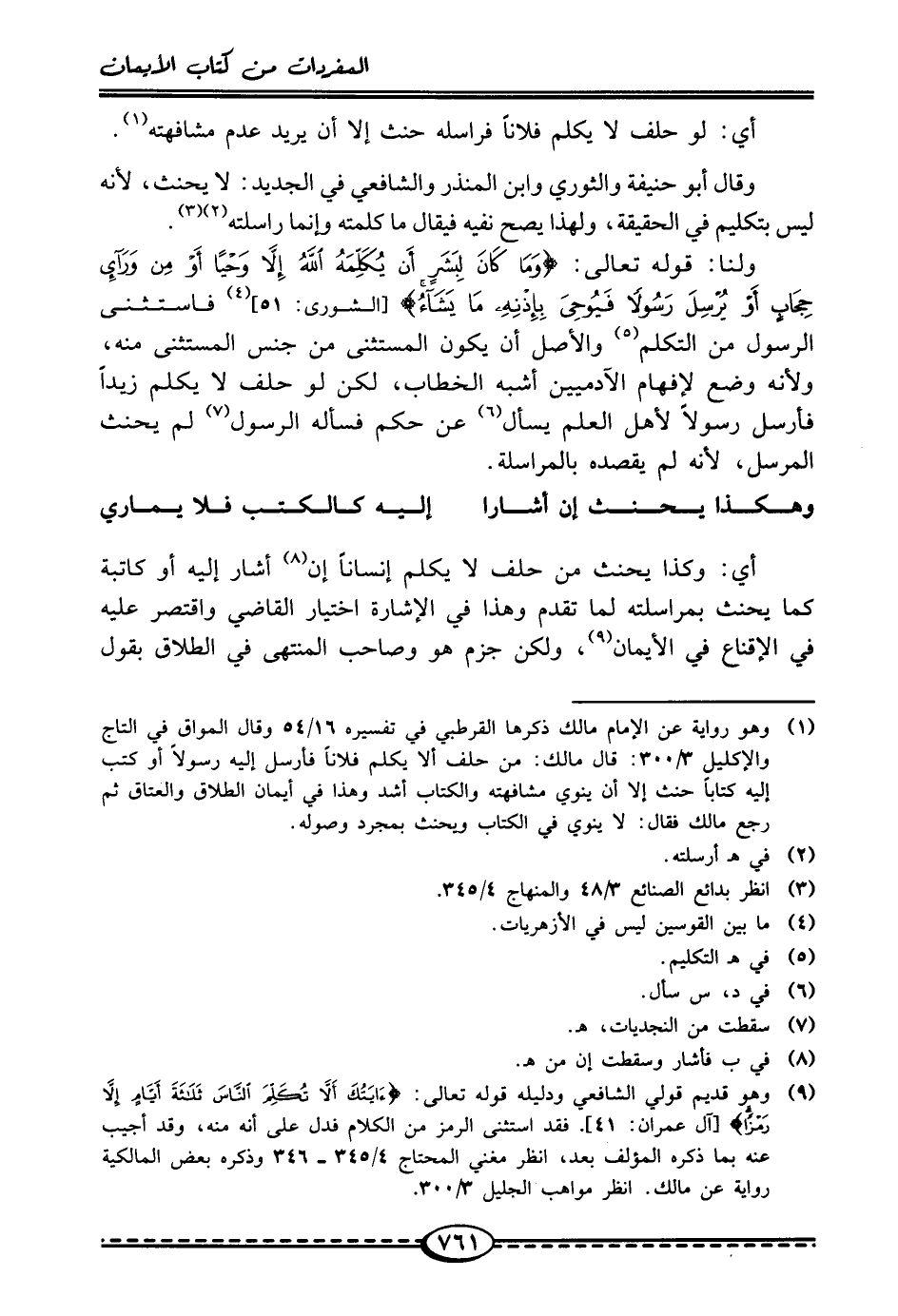 (¬1) وهو رواية عن الإمام مالك ذكرها القرطبي في تفسيره 16/ 54 وقال المواق في التاج والإكليل 3/ 300: قال مالك: من حلف ألَّا يكلم فلانًا فأرسل إليه رسولًا أو كتب إليه كتابًا حنث إِلَّا أن ينوي مشافهته والكتاب أشد وهذا في أيمان الطّلاق والعتاق ثمّ رجع مالك فقال: لا ينوي في الكتاب ويحنث بمجرد وصوله.