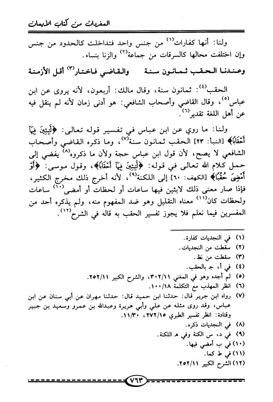 ولنا: ما روي عن ابن عبّاس في تفسير قوله تعالى: {لَابِثِينَ فِيهَا أَحْقَابًا (23)} [النبأ: 23]، الحقب ثمانون سنة (¬7)، وما ذكره القاضي وأصحاب الشّافعيّ لا يصح؛ لأنّ قول ابن عبّاس حجة ولأن ما ذكروه (¬8) يفضي إلى حمل كلام الله تعالى في قوله: {لَابِثِينَ فِيهَا أَحْقَابًا (23)}، وقول موسى: {أَوْ أَمْضِيَ حُقُبًا} [الكهف: 60]، إلى اللكنة (¬9)؛ لأنّه أخرج ذلك مخرج الكثير، فهذا صار معنى ذلك لابثين فيها ساعات أو لحظات أو أمضى (¬10) ساعات ولحظات كان (¬11) معناه التقليل وهو ضد المفهوم منه، ولم يذكره أحد من المفسرين فيما نعلم فلا يجوز تفسير الحقب به قاله في الشرح (¬12).