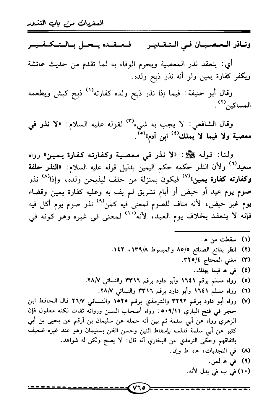 ولنا: قوله - صلى الله عليه وسلم -: "لا نذر في معصية وكفارته كفارة يمين" رواه سعيد (¬6) ولأن النَّذْر حكمه حكم اليمين بدليل قوله -عليه السّلام-: "النَّذْر حلفة وكفارت كفارة يمين" (¬7) فيكون بمنزلة من حلف ليذبحن ولده، وإذا (¬8) نذر صوم يوم عيد أو حيض أو أيّام تشرين لم يف به وعليه كفارة يمين وقضاء يوم غير حيض؛ لأنّه مناف للصوم لمعنى فيه كمن (¬9) نذر صوم يوم أكل فيه فإنّه لا ينعقد بخلاف يوم العيد؛ لأنّه (¬10) لمعنى في غيره وهو كونه في