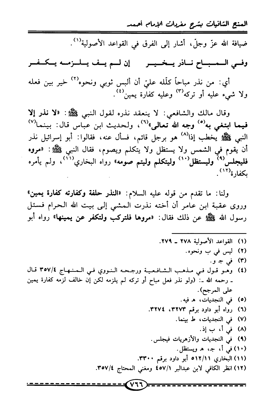 (¬4) وهو قول في مذهب الشّافعيّة ورجحه النووي في المنهاج 4/ 357 قال -رحمه الله-: (ولو نذر فعل مباح أو تركه لم يلزمه لكن إنَّ خالف لزمه كفارة يمين على المرجح).