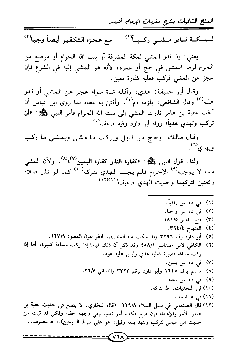 ولنا: قول النبي - صلى الله عليه وسلم -: "كفارة النَّذْر كفارة اليمين (¬7) " (¬8)، ولأن المشي ممّا لا يوجبه (¬9) الإحرام فلم يجب الهدي بتركه (¬10) كما لو نذر صلاة ركعتين فتركهما وحديث الهدي ضعيف (¬11) (¬12).