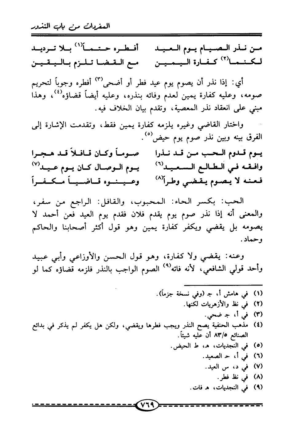 الحب: بكسر الحاء: المحبوب، والقافل: الراجع من سفر، والمعنى أنَّه إذا نذر صوم يوم يقدم فلان فقدم يوم العيد فعن أحمد لا يصومه بل يقضي ويكفر كفارة يمين وهو قول أكثر أصحابنا والحاكم وحماد.