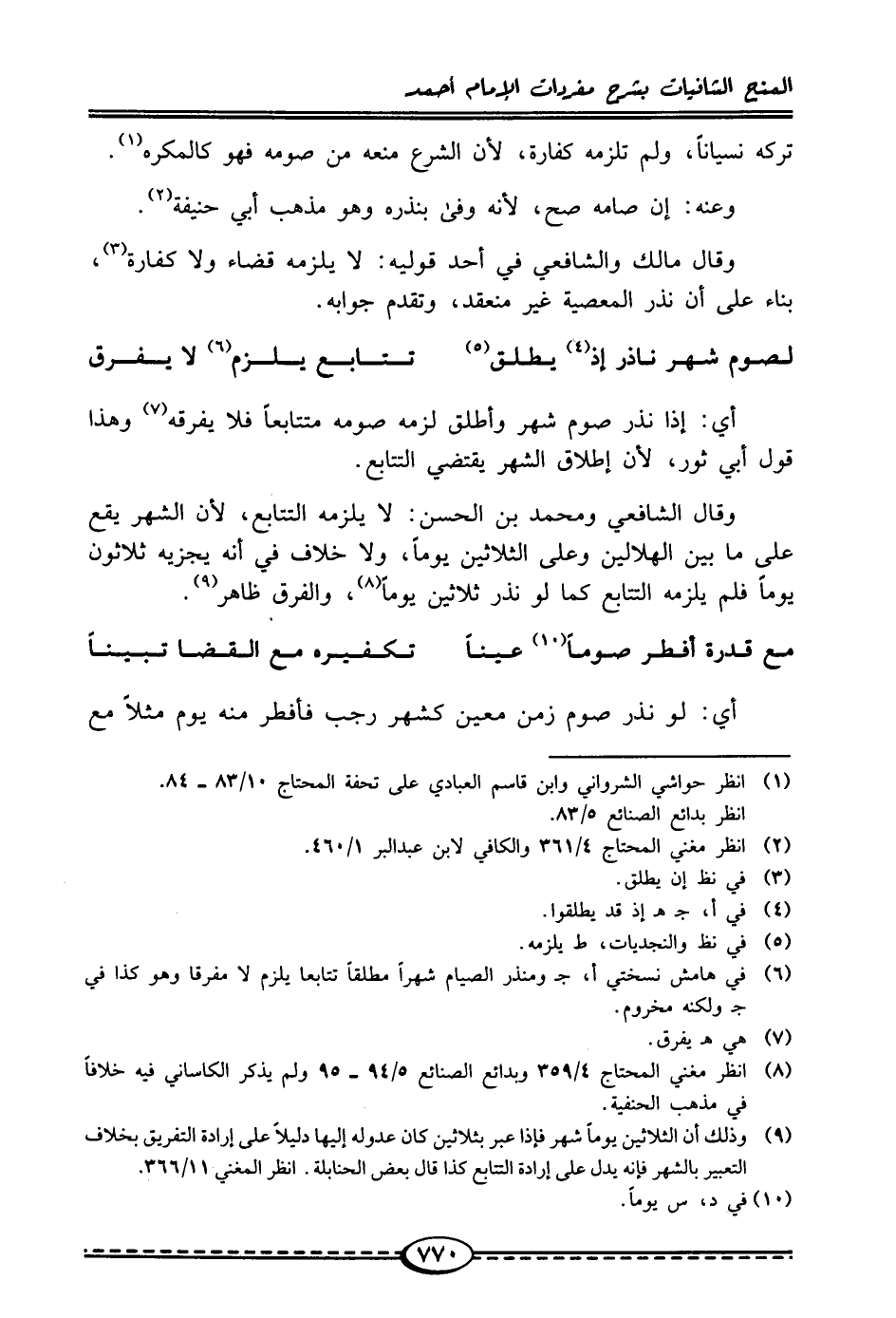 (¬6) في هامش نسختي أ، جـ ومنذر الصِّيام شهرًا مطلقًا تتابعا يلزم لا مفرقا وهو كذا في جـ ولكنه مخروم.