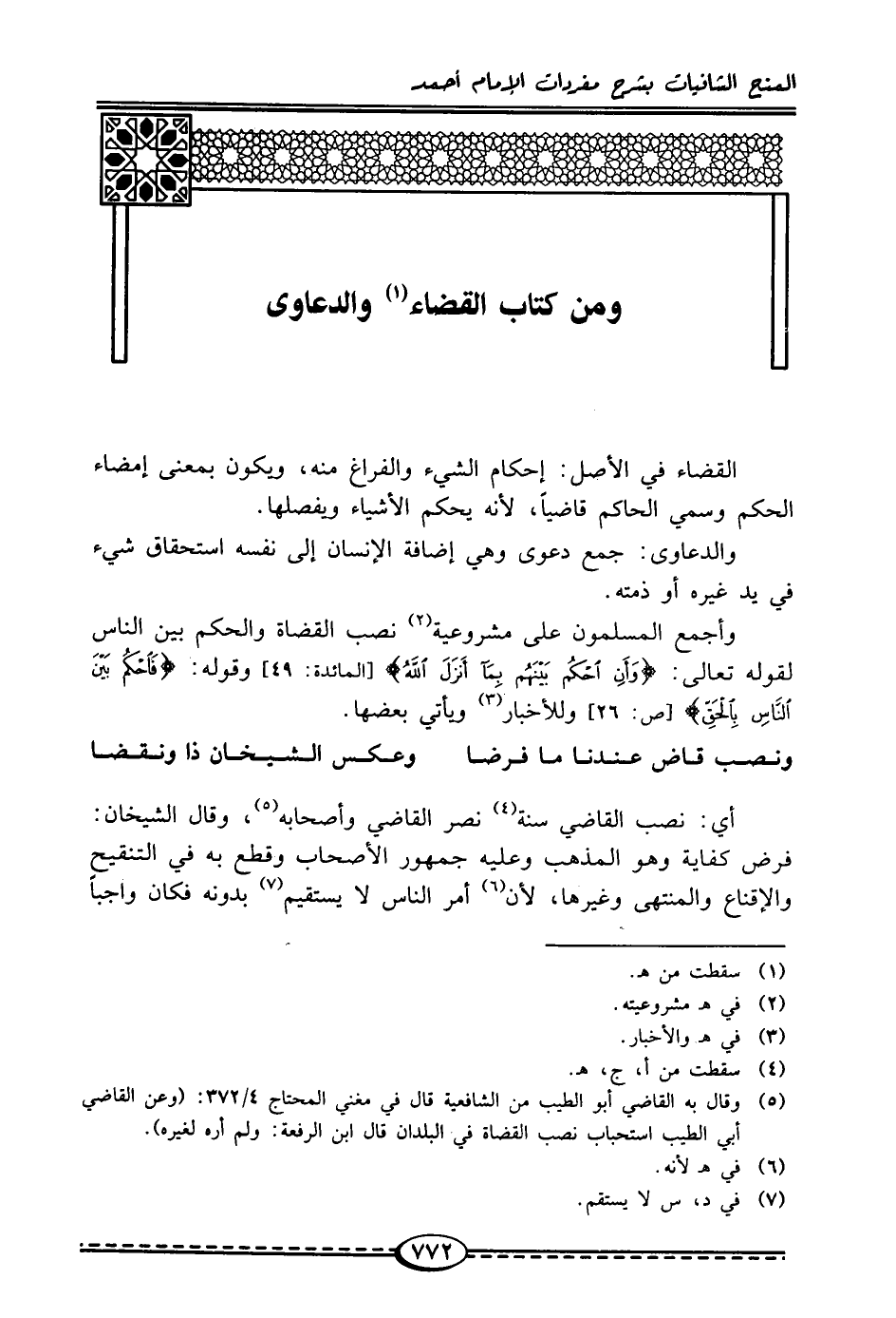 أي: نصب القاضي سنة (¬4) نصر القاضي وأصحابه (¬5)، وقال الشيخان: فرض كفاية وهو المذهب وعليه جمهور الأصحاب وقطع به في التنقيح والإقناع والمنتهى وغيرها؛ لأنّ (¬6) أمر النَّاس لا يستقيم (¬7) بدونه فكان واجبًا