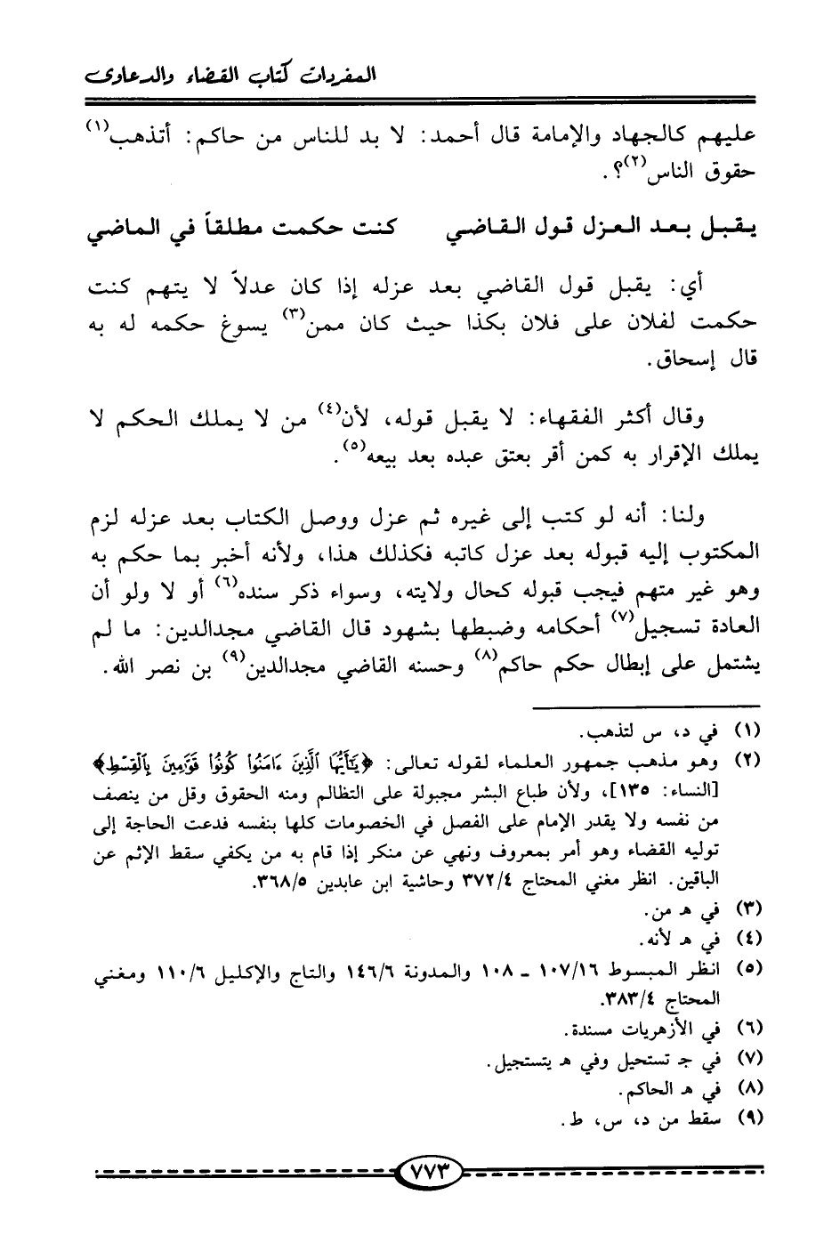 ولنا: أنَّه لو كتب إلى غيره ثمّ عزل ووصل الكتاب بعد عزله لزم المكتوب إليه قبوله بعد عزل كاتبه فكذلك هذا، ولأنّه أخبر بما حكم به وهو غير متهم فيجب قبوله كحال ولايته، وسواء ذكر سنده (¬6) أو لا ولو أن العادة تسجيل (¬7) أحكامه وضبطها بشهود قال القاضي مجد الدين: ما لم يشتمل على إبطال حكم حاكم (¬8) وحسنه القاضي مجد الدين (¬9) بن نصر الله.