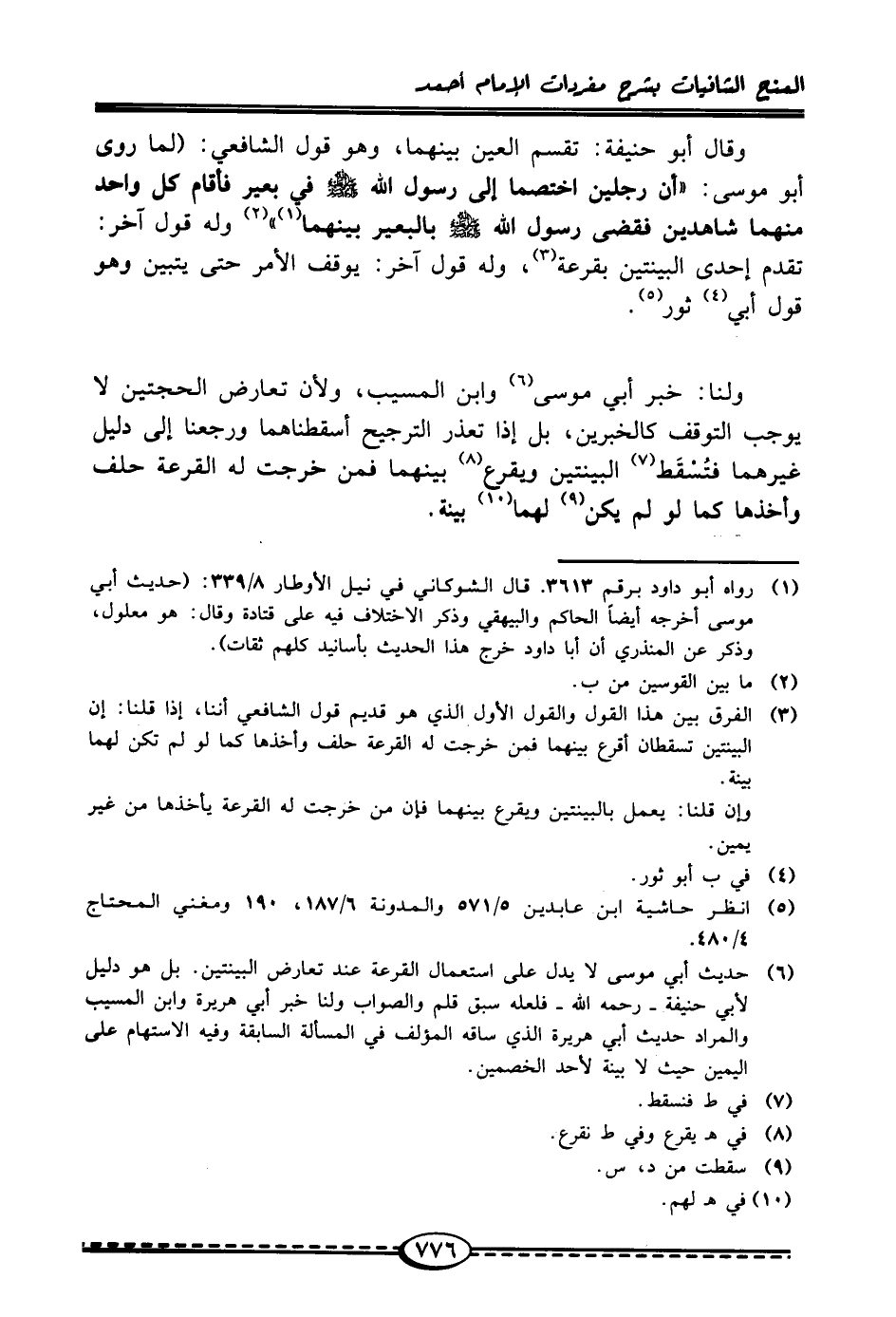 (¬6) حديث أبي موسى لا يدلّ على استعمال القرعة عند تعارض البينتين. بل هو دليل لأبي حنيفة -رحمه الله- فلعلّه سبق قلم والصواب ولنا خبر أبي هريرة وابن المسيّب والمراد حديث أبي هريرة الّذي ساقه المؤلِّف في المسألة السابقة وفيه الاستهام على اليمين حيث لا بينة لأحد الخصمين.