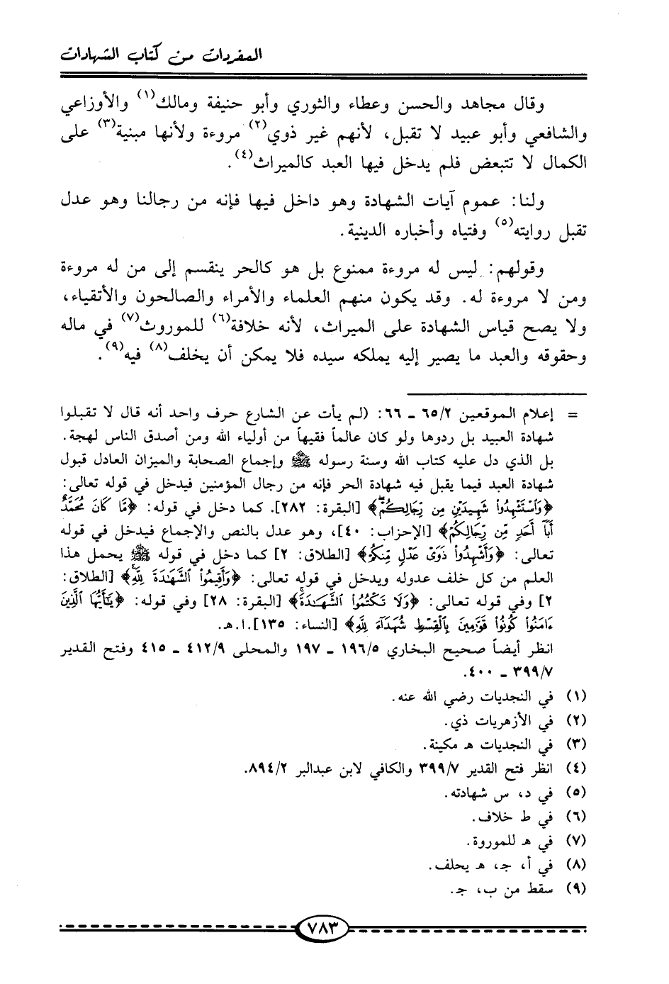 = إعلام الموقعين 2/ 65 - 66: (لم يأت عن الشارع حرف واحد أنَّه قال لا تقبلوا شهادة العبيد بل ردوها ولو كان عالمًا فقيهًا من أولياء الله ومن أصدق النَّاس لهجة. بل الّذي دل عليه كتاب الله وسنة رسوله - صلى الله عليه وسلم - وإجماع الصّحابة والميزان العادل قبول شهادة العبد فيما يقبل فيه شهادة الحر فإنّه من رجال المؤمنين فيدخل في قوله تعالى: {وَاسْتَشْهِدُوا شَهِيدَيْنِ مِنْ رِجَالِكُمْ} [البقرة: 282]. كما دخل في قوله: {مَا كَانَ مُحَمَّدٌ أَبَا أَحَدٍ مِنْ رِجَالِكُمْ} [الأحزاب: 40]، وهو عدل بالنص والإجماع فيدخل في قوله تعالى: {وَأَشْهِدُوا ذَوَيْ عَدْلٍ مِنْكُمْ} [الطّلاق: 2] كما دخل في قوله - صلى الله عليه وسلم - يحمل هذا العلم من كلّ خلف عدوله ويدخل في قوله تعالى: {وَأَقِيمُوا الشَّهَادَةَ لِلَّهِ} [الطّلاق: 2]، وفي قوله تعالى: {وَلَا تَكْتُمُوا الشَّهَادَةَ} [البقرة: 283]، وفي قوله: {يَاأَيُّهَا الَّذِينَ آمَنُوا كُونُوا قَوَّامِينَ بِالْقِسْطِ شُهَدَاءَ لِلَّهِ} [النِّساء: 135]. أ. هـ.