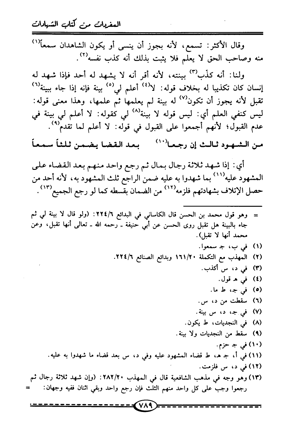 (¬13) وهو وجه في مذهب الشّافعيّة قال في المهذب 20/ 282: (وإن شهد ثلاثة رجال ثمّ رجعوا وجب على كلّ واحد منهم الثلث فإن رجع واحد وبقي اثنان ففيه وجهان: =