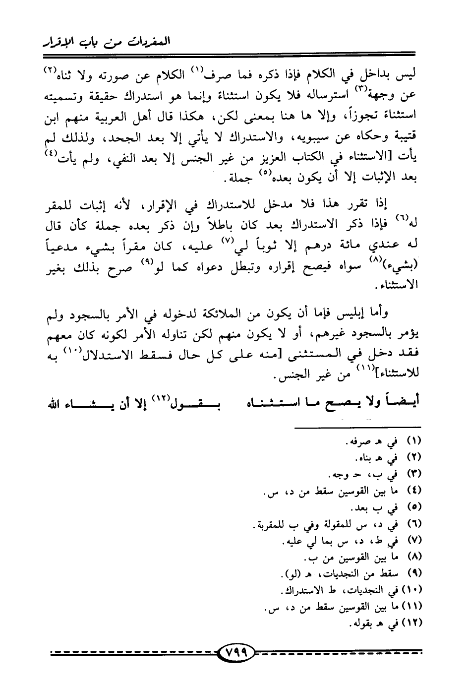 ليس بداخل في الكلام فإذا ذكره فما صرف (¬1) الكلام عن صورته ولا ثناه (¬2) عن وجهة (¬3) استرساله فلا يكون استثناءً وإنّما هو استدراك حقيقة وتسميته استثناءً تجوزًا، وإلا هاهنا بمعنى لكن، هكذا قال أهل العربيّة منهم ابن قتيبة وحكاه عن سيبويه، والاستدراك لا يأتي إِلَّا بعد الجحد، ولذلك لم يأت [الاستثناء في الكتاب العزيز من غير الجنس إِلَّا بعد النفي، ولم يأت (¬4) بعد الإثبات إِلَّا أن يكون بعده (¬5) جملة.