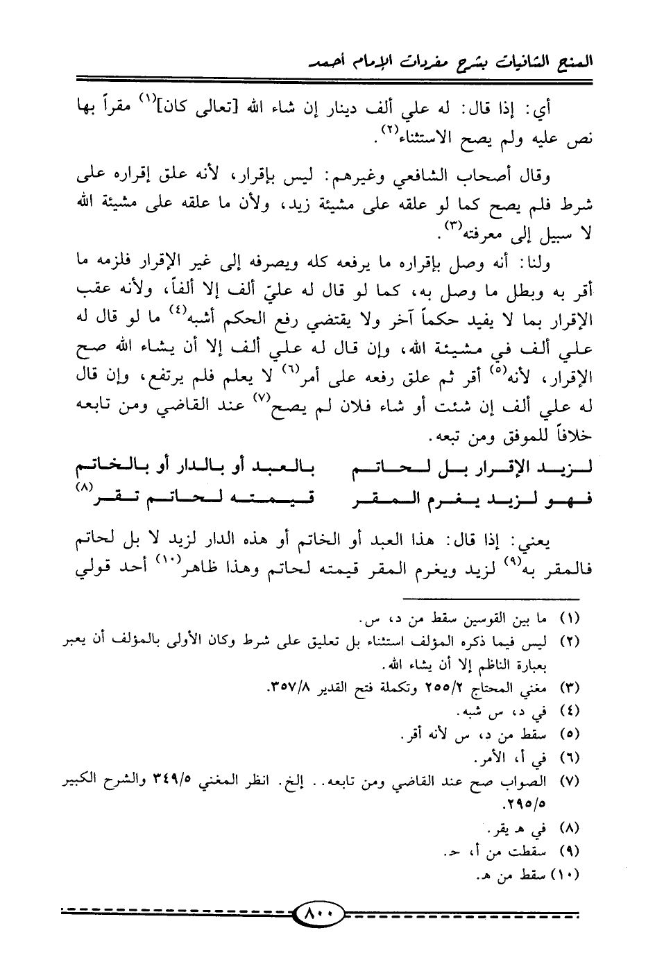 ولنا: أنه وصل بإقراره ما يرفعه كله ويصرفه إلى غير الإقرار فلزمه ما أقر به وبطل ما وصل به، كما لو قال له علي ألف إلا ألفًا، ولأنه عقب الإقرار بما لا يفيد حكما آخر ولا يقتضي رفع الحكم أشبه (¬4) ما لو قال له علي ألف في مشيئة الله، وإن قال له علي ألف إلا أن يشاء الله صح الإقرار، لأنه (¬5) أقر ثم علق رفعه على أمر (¬6) لا يعلم فلم يرتفع، وإن قال له علي ألف إن شئت أو شاء فلان لم يصح (¬7) عند القاضي ومن تابعه خلافًا للموفق ومن تبعه.