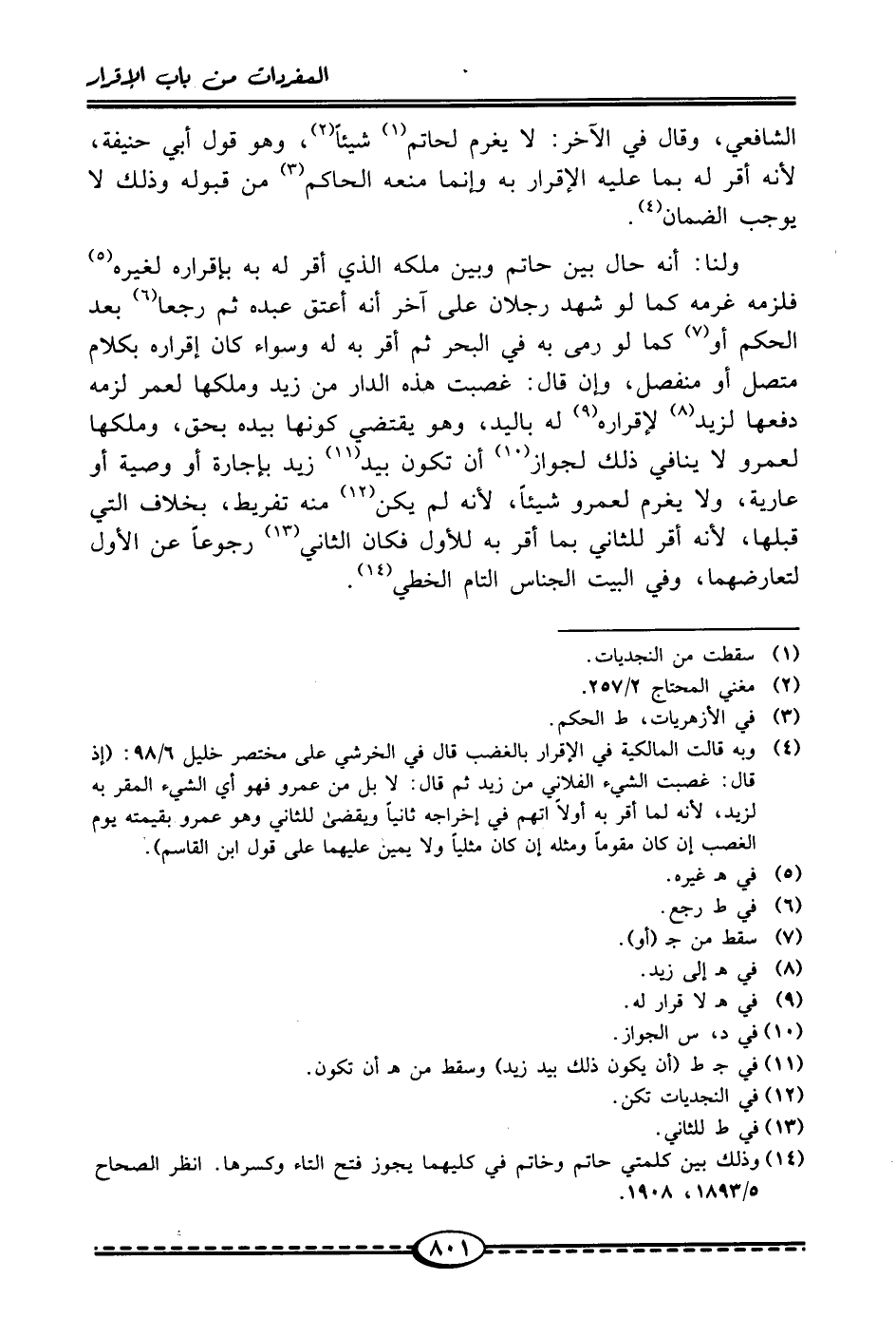 ولنا: أنه حال بين حاتم وبين ملكه الذي أقر له به بإقراره لغيره (¬5) فلزمه غرمه كما لو شهد رجلان على آخر أنه أعتق عبده ثم رجعا (¬6) بعد الحكم أو (¬7) كما لو رمى به في البحر ثم أقر به له وسواء كان إقراره بكلام متصل أو منفصل، وإن قال: غصبت هذه الدار من زيد وملكها لعمر لزمه دفعها لزيد (¬8) لإقراره (¬9) له باليد، وهو يقتضي كونها بيده بحق، وملكها لعمرو لا ينافي ذلك لجواز (¬10) أن تكون بيد (¬11) زيد بإجارة أو وصية أو عارية، ولا يغرم لعمرو شيئًا، لأنه لم يكن (¬12) منه تفريط، بخلاف التي قبلها، لأنه أقر للثاني بما أقر به للأول فكان الثاني (¬13) رجوعًا عن الأول لتعارضهما، وفي البيت الجناس التام الخطي (¬14).