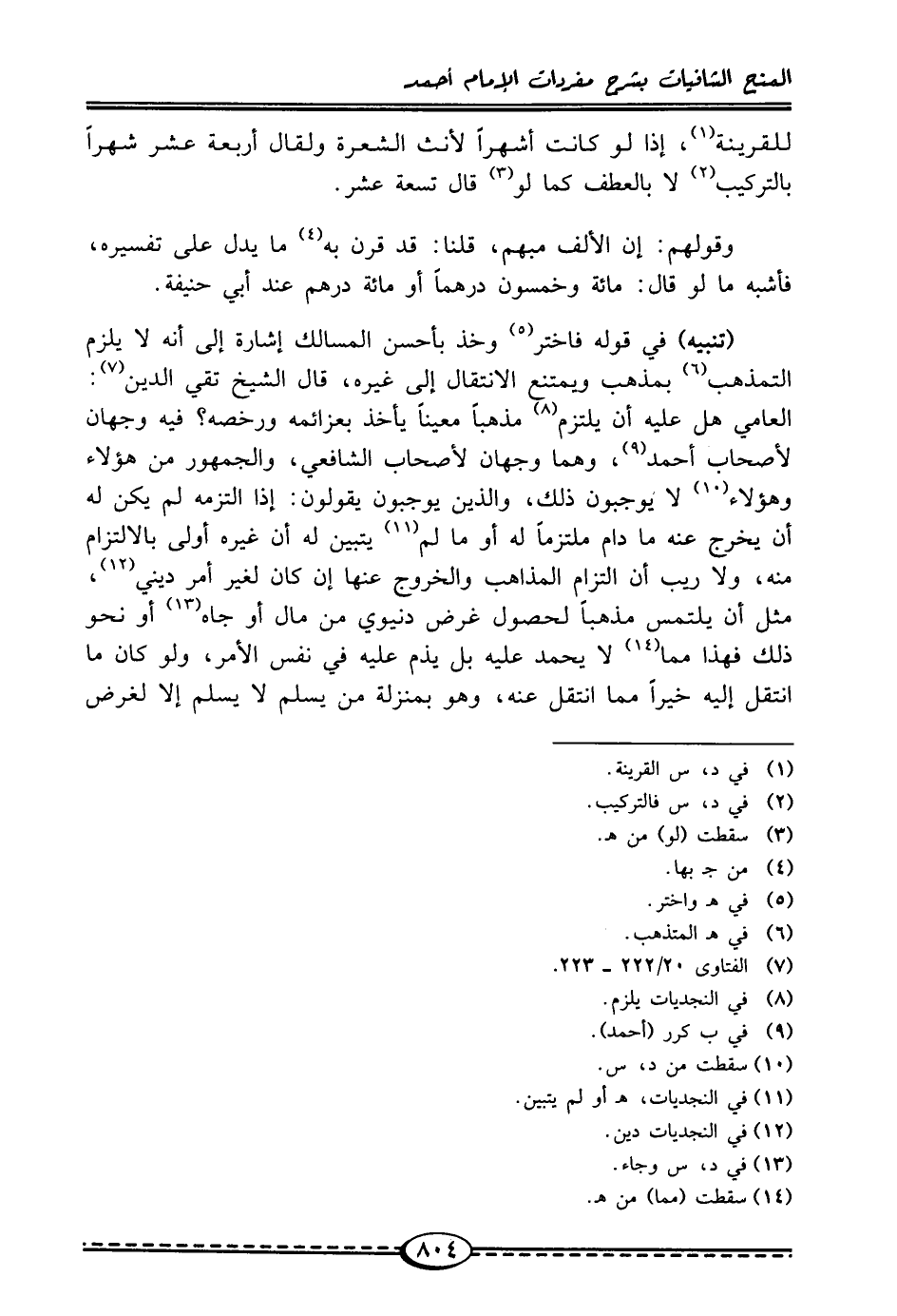 (تنبيه) في قوله فاختر (¬5) وخذ بأحسن المسالك إشارة إلى أنه لا يلزم التمذهب (¬6) بمذهب ويمتنع الانتقال إلى غيره، قال الشيخ تقي الدين (¬7): العامي هل عليه أن يلتزم (¬8) مذهبًا معينًا يأخذ بعزائمه ورخصه؟ فيه وجهان لأصحاب أحمد (¬9)، وهما وجهان لأصحاب الشافعي، والجمهور من هؤلاء وهؤلاء (¬10) لا يوجبون ذلك، والذين يوجبون يقولون: إذا التزمه لم يكن له أن يخرج عنه ما دام ملتزمًا له أو ما لم (¬11) يتبين له أن غيره أولى بالالتزام منه، ولا ريب أن التزام المذاهب والخروج عنها إن كان لغير أمر ديني (¬12)، مثل أن يلتمس مذهبًا لحصول غرض دنيوي من مال أو جاه (¬13) أو نحو ذلك فهذا مما (¬14) لا يحمد عليه بل يذم عليه في نفس الأمر، ولو كان ما انتقل إليه خيرًا مما انتقل عنه، وهو بمنزلة من يسلم لا يسلم إلا لغرض