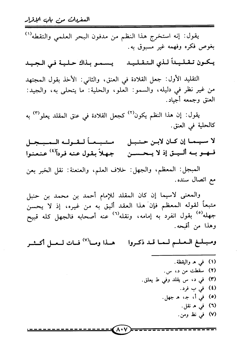 والمعنى لا سيما إن كان المقلد للإمام أحمد بن محمَّد بن حنبل متبعًا لقوله المعظم فإن هذا العقد أليق به من غيره، إذ لا يحسن جهله (¬5) بقول انفرد به إمامه، ونقله (¬6) عنه أصحابه فالجهل كله قبيح وهذا من أقبحه.
