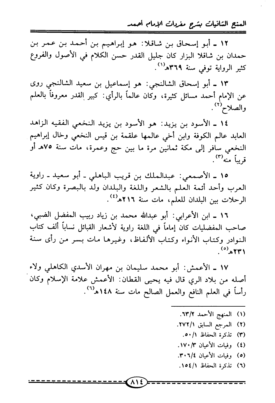 15 - الأصمعي: عبد الملك بن قريب الباهلي -أبو سعيد- راوية العرب وأحد أئمة العلم بالشعر واللغة والبلدان ولد بالبصرة وكان كثير الرحلات بين البلدان للعلم، مات سنة 216 هـ (¬4).