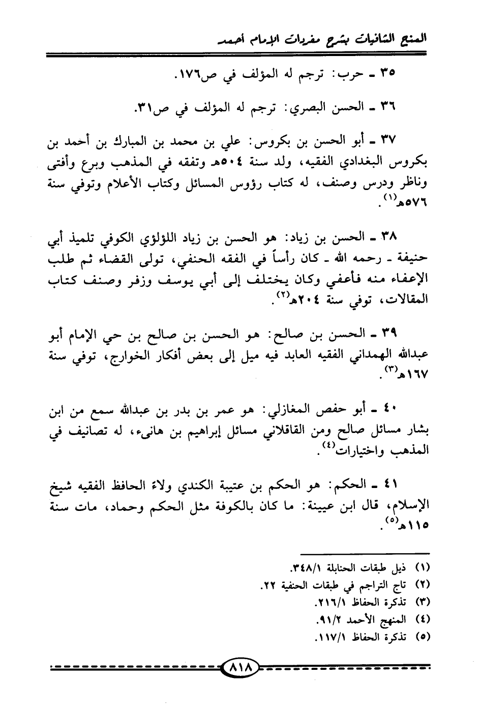 37 - أبو الحسن بن بكروس: علي بن محمَّد بن المبارك بن أحمد بن بكروس البغدادي الفقيه، ولد سنة 504 هـ وتفقه في المذهب وبرع وأفتى وناظر ودرس وصنف، له كتاب رؤوس المسائل وكتاب الأعلام وتوفي سنة 576هـ (¬1).