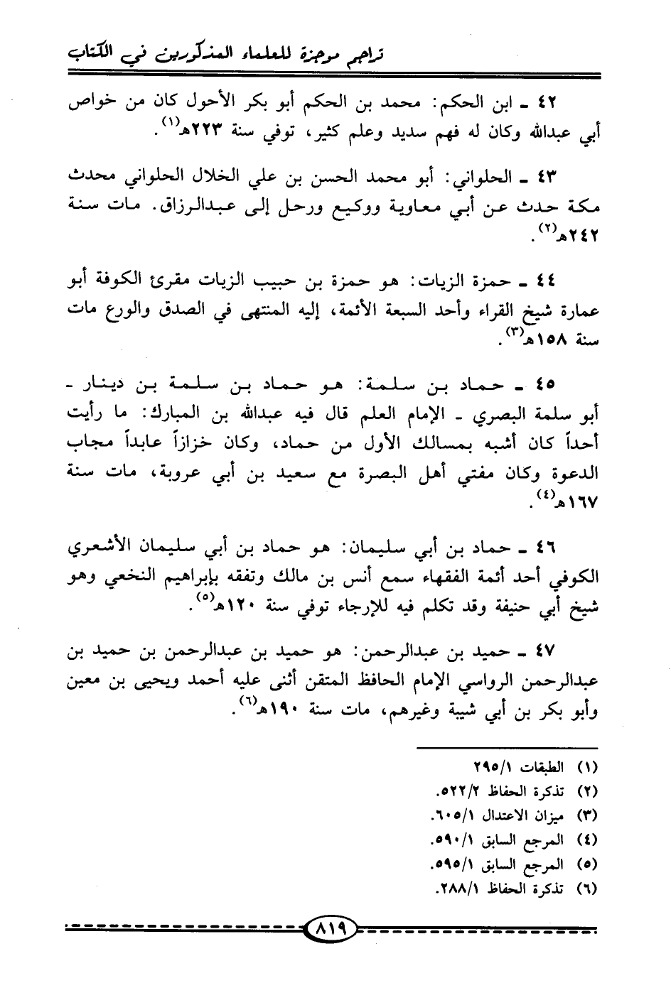 46 - حماد بن أبي سليمان: هو حماد بن أبي سليمان الأشعري الكوفي أحد أئمة الفقهاء سمع أنس بن مالك وتفقه بإبراهيم النخعي وهو شيخ أبي حنيفة وقد تكلم فيه للإرجاء توفي سنة 120 هـ (¬5).