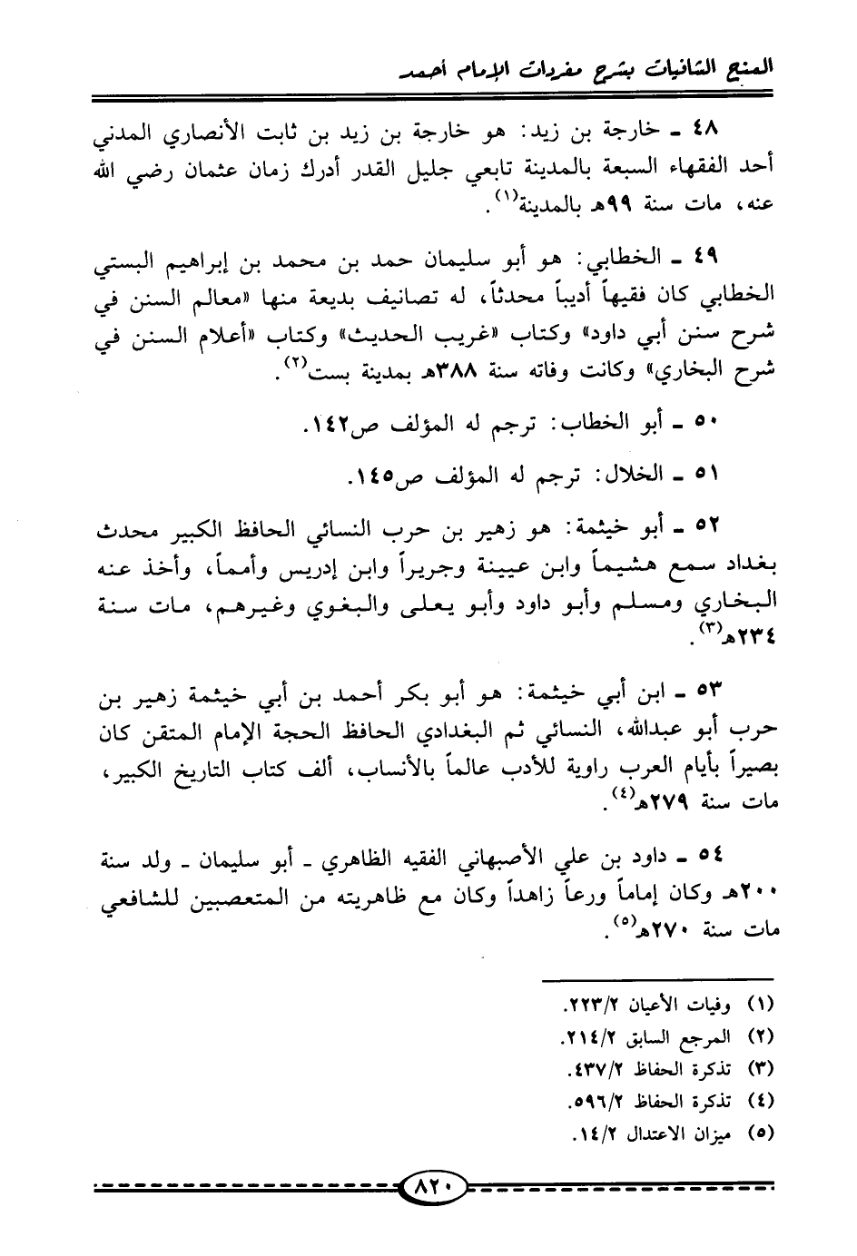 54 - داود بن علي الأصبهاني الفقيه الظاهري -أبو سليمان- ولد سنة 200 هـ وكان إمامًا ورعًا زاهدًا وكان مع ظاهريته من المتعصبين للشافعي مات سنة 270هـ (¬5).