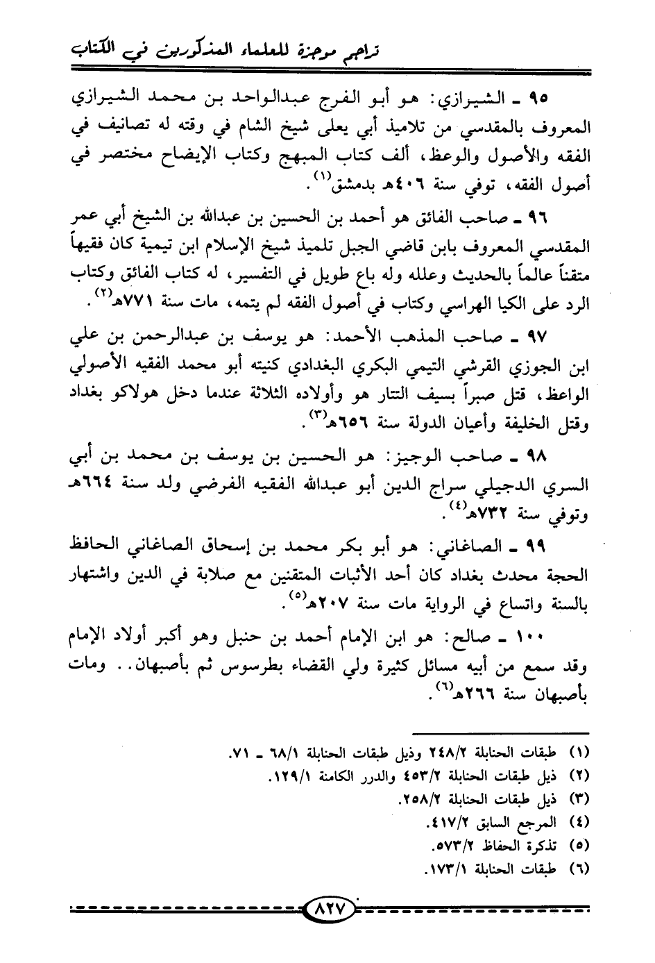 95 - الشيرازي: هو أبو الفرج عبد الواحد بن محمَّد الشيرازي المعروف بالمقدسي من تلاميذ أبي يعلى شيخ الشام في وقته له تصانيف في الفقه والأصول والوعظ، ألف كتاب المبهج وكتاب الإيضاح مختصر في أصول الفقه، توفي سنة 406 هـ بدمشق (¬1).