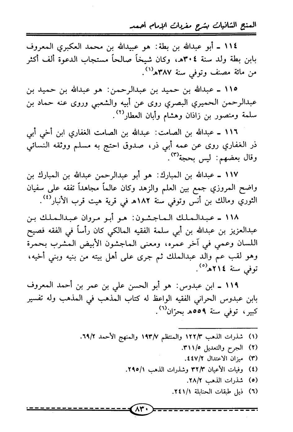 114 - أبو عبد الله بن بطة: هو عبيد الله بن محمَّد العكبري المعروف بابن بطة ولد سنة 304 هـ، وكان شيخًا صالحًا مستجاب الدعوة ألف أكثر من مائة مصنف وتوفي سنة 387هـ (¬1).
