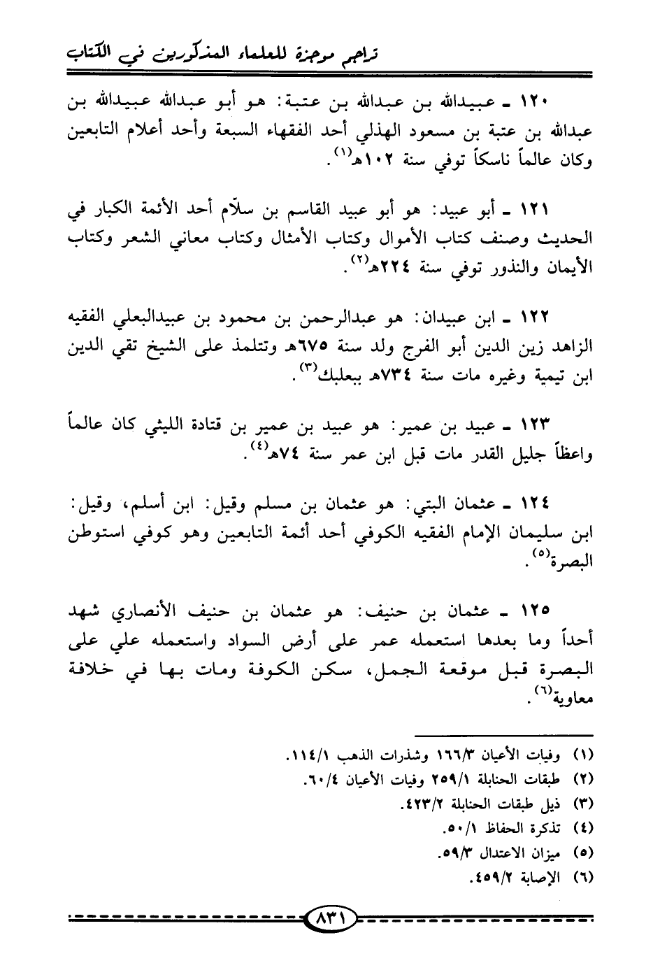 120 - عبيد الله بن عبد الله بن عتبة: هو أبو عبد الله عبيد الله بن عبد الله بن عتبة بن مسعود الهذلي أحد الفقهاء السبعة وأحد أعلام التابعين وكان عالمًا ناسكًا توفي سنة 102 هـ (¬1).