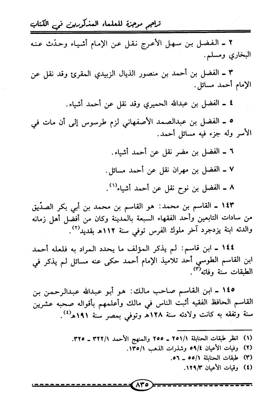 144 - ابن قاسم: لم يذكر المؤلف ما يحدد المراد به فلعله أحمد ابن القاسم الطوسي أحد تلاميذ الإمام أحمد حكى عنه مسائل لم يذكر في الطبقات سنة وفاته (¬3).