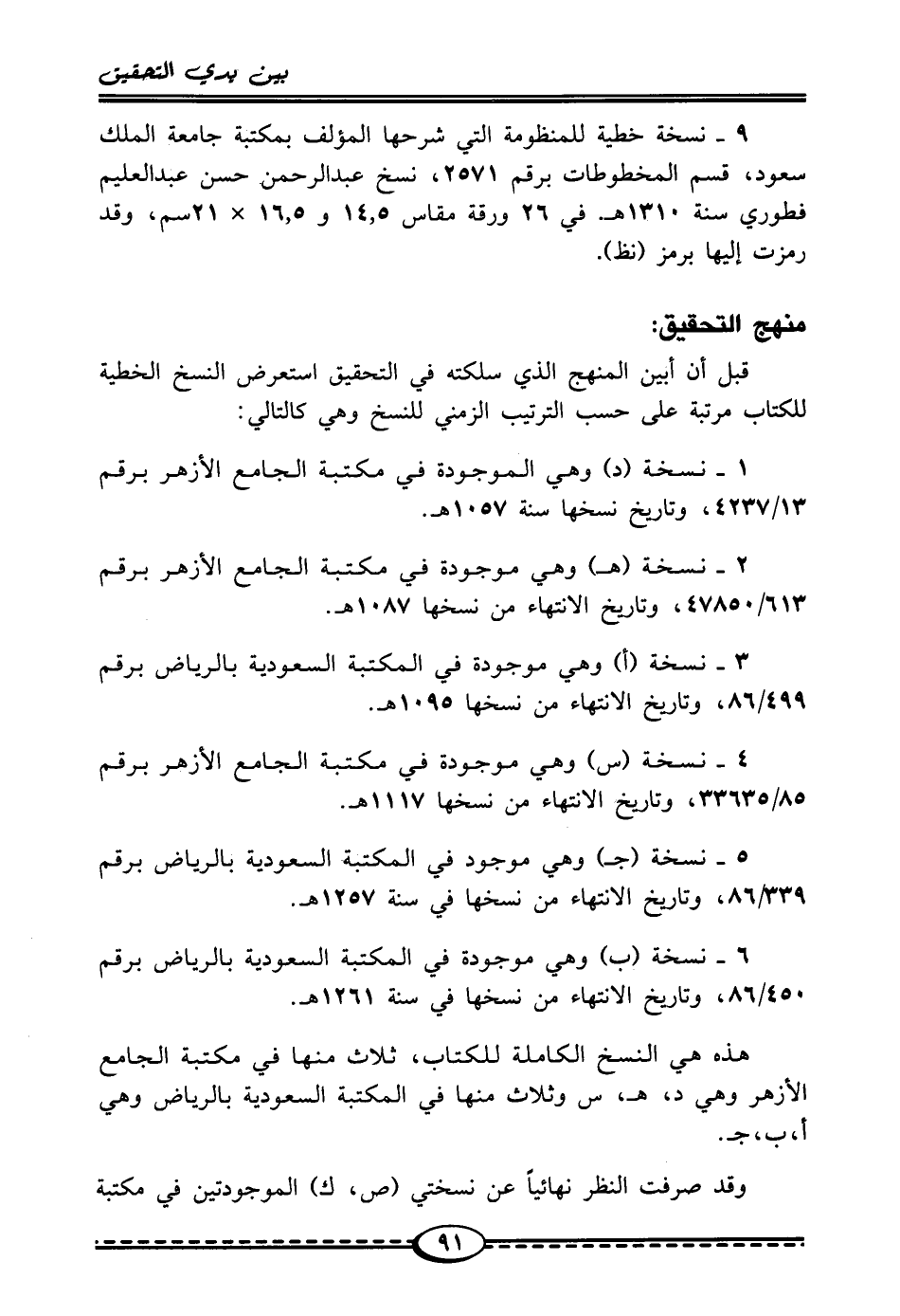 9 - نسخة خطية للمنظومة التي شرحها المؤلف بمكتبة جامعة الملك سعود، قسم المخطوطات برقم 2571، نسخ عبد الرحمن حسن عبد العليم فطوري سنة 1310 هـ في 26 ورقة مقاس 14.5 و 16.5× 21 سم، وقد رمزت إليها برمز (نظ).