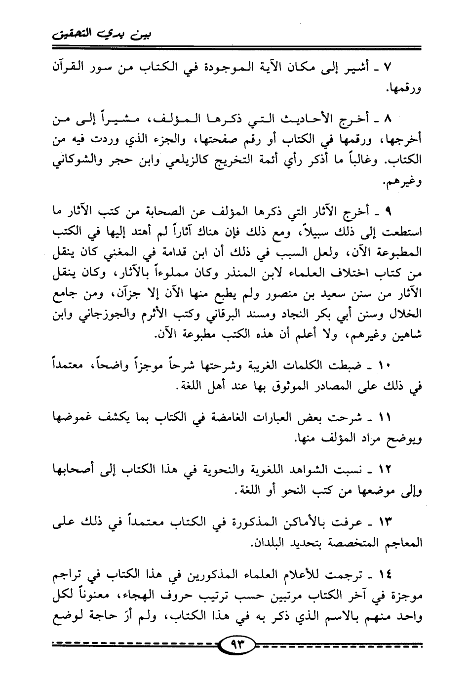 8 - أخرج الأحاديث التي ذكرها المؤلف، مشيرًا إلى من أخرجها، ورقمها في الكتاب أو رقم صفحتها، والجزء الذي وردت فيه من الكتاب. وغالبًا ما أذكر رأي أئمة التخريج كالزيلعي وابن حجر والشوكاني وغيرهم.