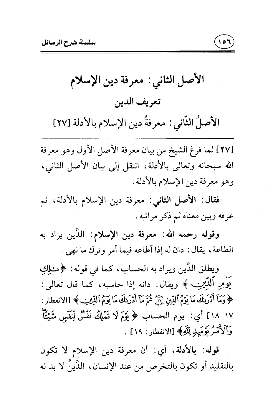 [27] لما فرغ الشيخ من بيان معرفة الأصل الأول وهو معرفة الله سبحانه وتعالى بالأدلة، انتقل إلى بيان الأصل الثاني، وهو معرفة دين الإسلام بالأدلة.