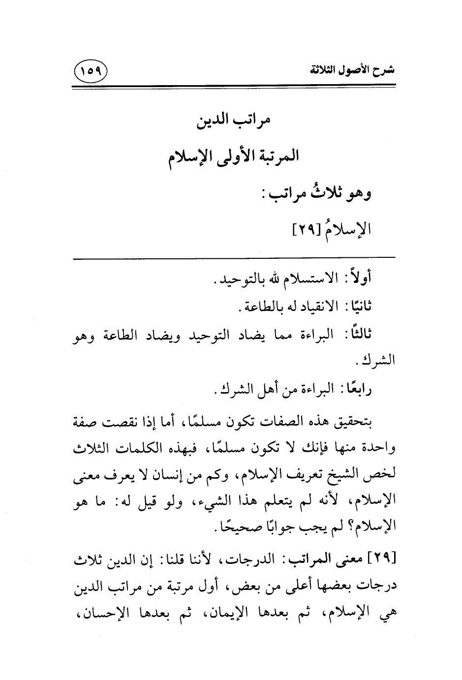 [29] معنى المراتب: الدرجات؛ لأننا قلنا أن الدين ثلاث درجات بعضها أعلى من بعض، أول مرتبة من مراتب الدين هي الإسلام، ثم بعدها الإيمان، ثم بعدها الإحسان