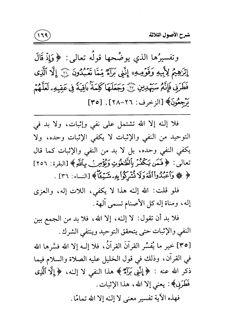 [35] خير ما يفسر القرآن القرآنُ، فلا إله إلا الله فسرها الله في القرآن، وذلك في قول الخليل عليه الصلاة والسلام فيما ذكر الله عنه: {إِنَّنِي بَرَاءٌ} هذا النفي لا إله، {إِلَّا الَّذِي فَطَرَنِي} : يعني إلا الله، هذا الإثبات.