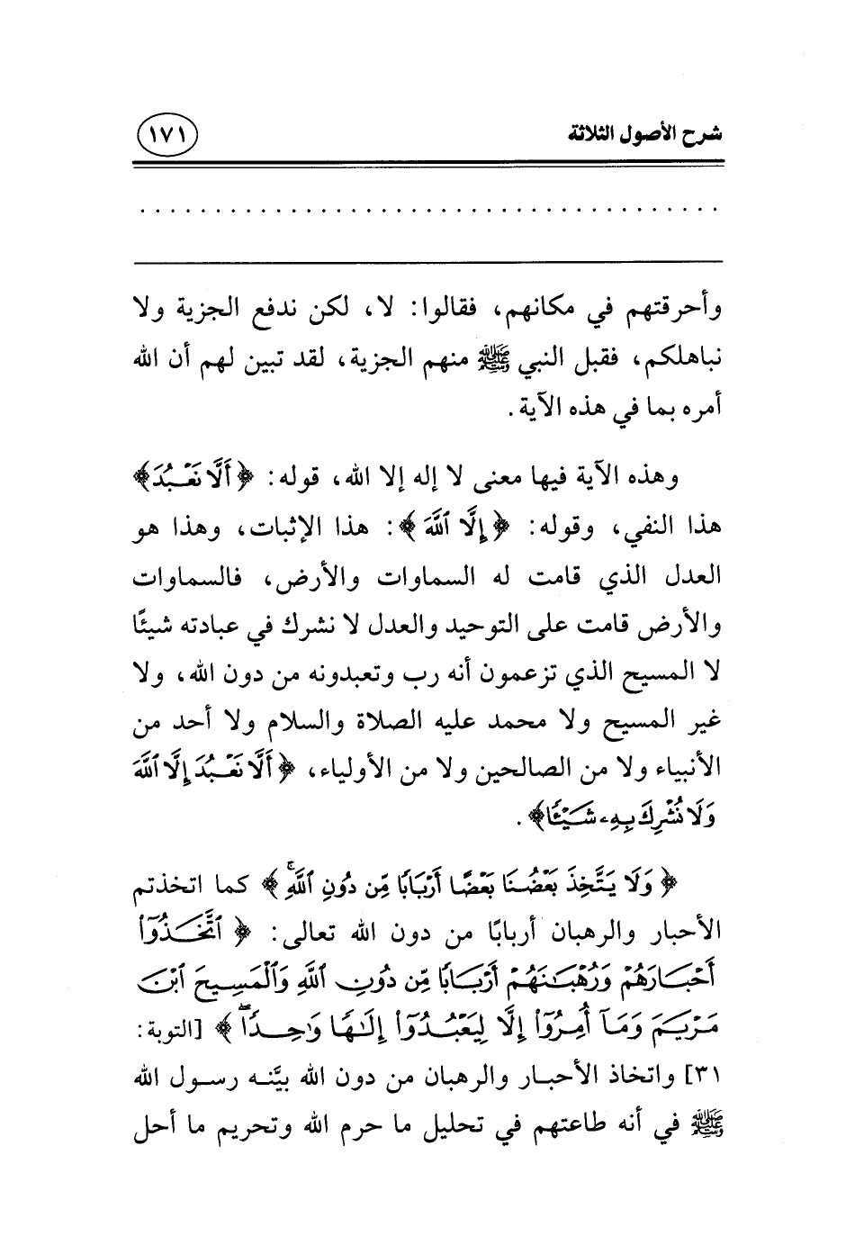 وهذه الآية فيها معنى لا إله إلا الله، قوله: ألا نعبد هذا النفي، وقوله: إلا الله هذا الإثبات، وهذا هو العدل الذي قامت له السماوات والأرض، فالسماوات والأرض قامت على التوحيد والعدل، لا نشرك في عبادته شيئًا لا المسيح الذي تزعمون أنه رب وتعبدونه من دون الله، ولا غير المسيح ولا محمد عليه الصلاة والسلام، ولا أحد من الأنبياء ولا من الصالحين ولا من الأولياء، {أَلَّا نَعْبُدَ إِلَّا اللَّهَ وَلَا نُشْرِكَ بِهِ شَيْئًا} .