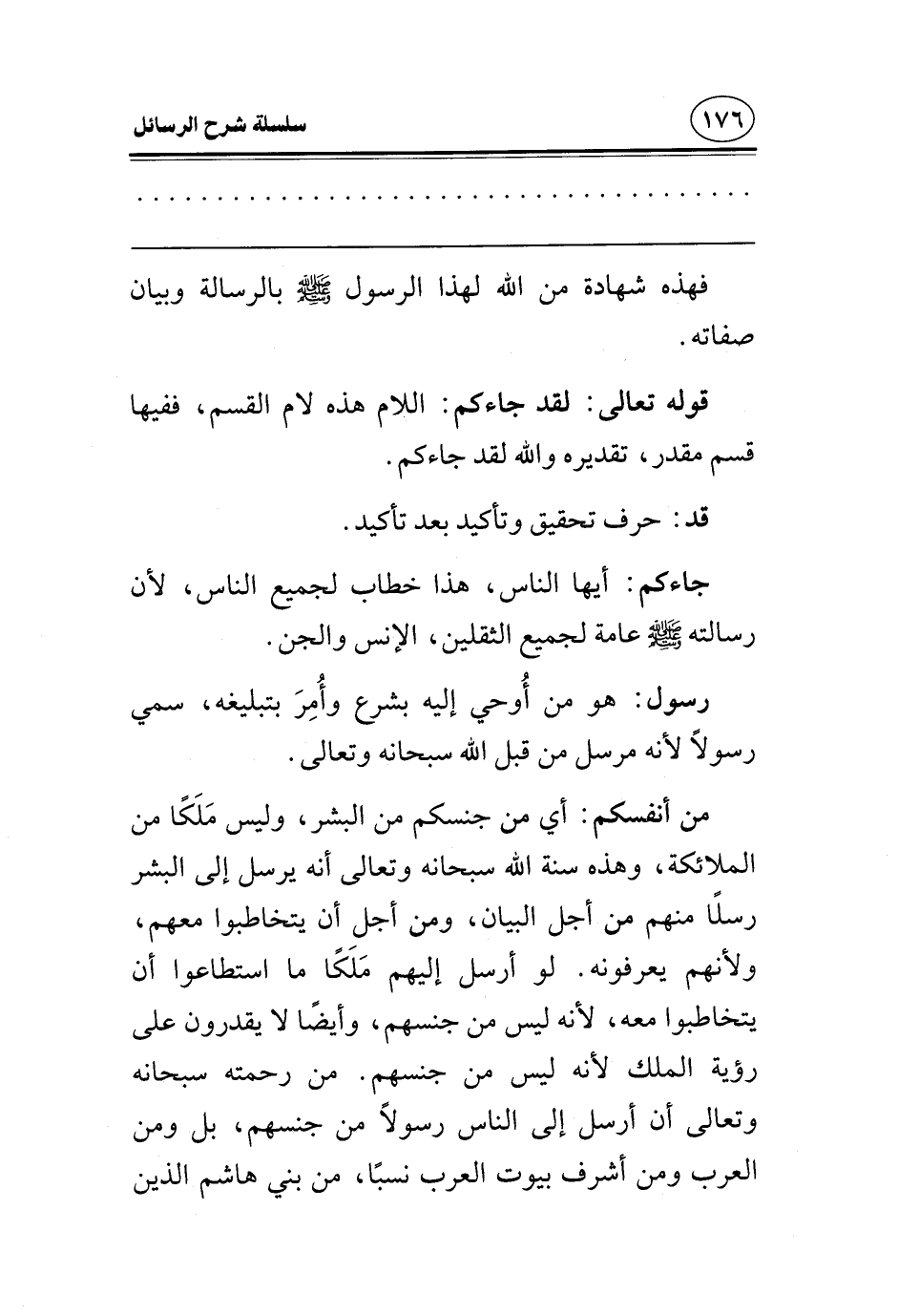 من أنفسكم: أي من جنسكم من البشر، وليس ملكًا من الملائكة، وهذه سنة الله سبحانه وتعالى أنه يرسل إلى البشر رسلًا منهم من أجل البيان، ومن أجل أن يتخاطبوا معهم، ولأنهم يعرفونه، لو أرسل إليهم ملكا ما استطاعوا أن يتخاطبوا معه؛ لأنه ليس من جنسهم، وأيضًا لا يقدرون على رؤية الملك؛ لأنه ليس من جنسهم، من رحمته سبحانه وتعالى أن أرسل إلى الناس رسولًا من جنسهم، بل ومن العرب ومن أشرف بيوت العرب نسبًا، من بني هاشم الذين