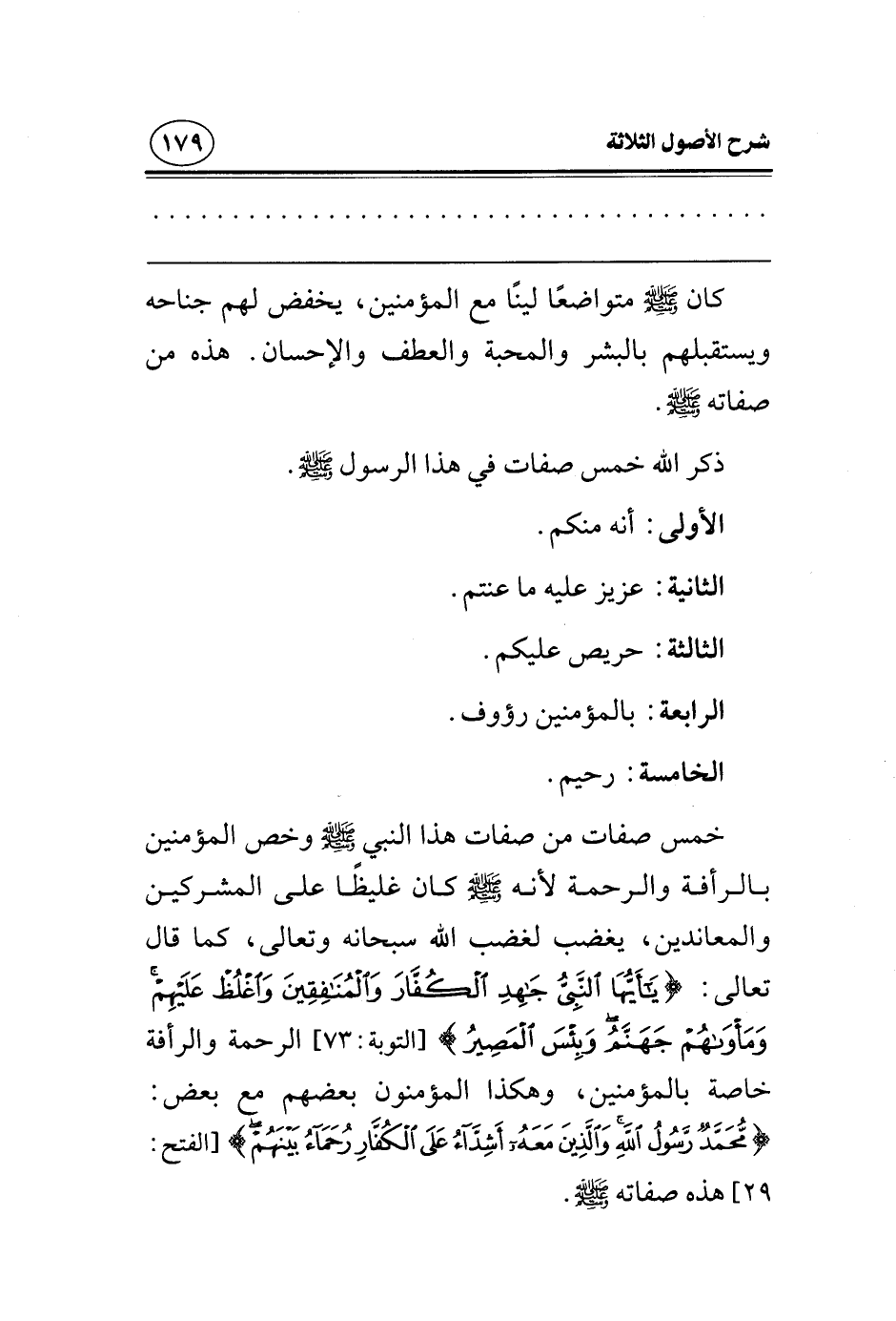 خمس صفات من صفات هذا النبي صلى الله عليه وسلم، وخص المؤمنين بالرأفة والرحمة؛ لأنه صلى الله عليه وسلم كان غليظًا على المشركين والمعاندين، يغضب لغضب الله سبحانه وتعالى، كما قال تعالى: {يَا أَيُّهَا النَّبِيُّ جَاهِدِ الْكُفَّارَ وَالْمُنَافِقِينَ وَاغْلُظْ عَلَيْهِمْ وَمَأْوَاهُمْ جَهَنَّمُ وَبِئْسَ الْمَصِيرُ} [التوبة: 73] الرحمة والرأفة خاصة بالمؤمنين، وهكذا المؤمنون بعضهم مع بعض: {مُحَمَّدٌ رَسُولُ اللَّهِ وَالَّذِينَ مَعَهُ أَشِدَّاءُ عَلَى الْكُفَّارِ رُحَمَاءُ بَيْنَهُمْ} [الفتح: 29] هذه صفاته صلى الله عليه وسلم.
