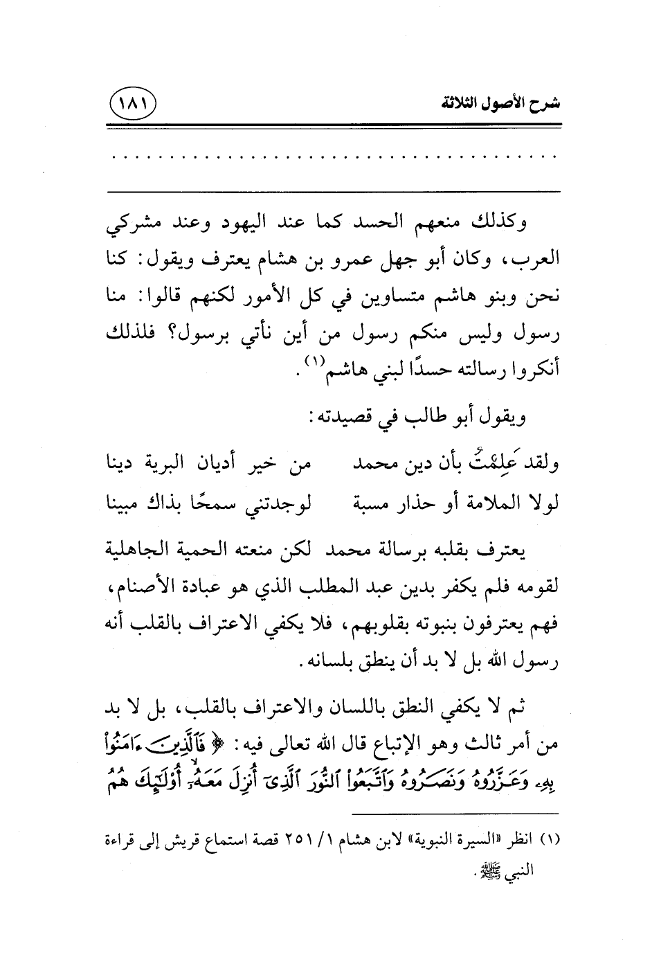 وكذلك منعهم الحسد كما عند اليهود وعند مشركي العرب، وكان أبو جهل عمرو بن هشام يعترف ويقول: كنا نحن وبنو هاشم متساوين في كل الأمور لكنهم قالوا: منا رسول وليس منكم رسول من أين نأتي برسول؟ فلذلك أنكروا رسالته حسدًا لبني هاشم. ويقول أبو طالب في قصيدته: