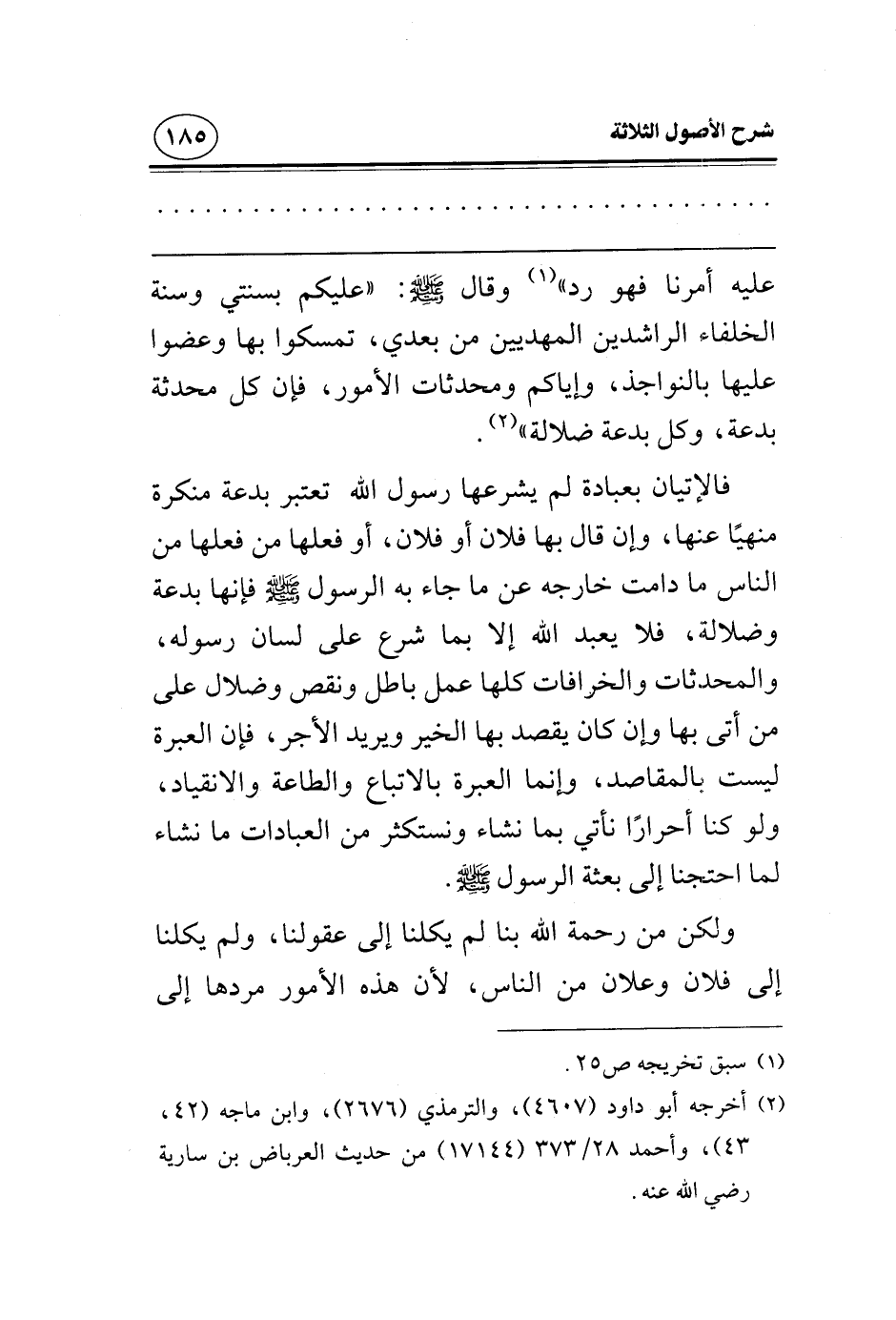 «عليه أمرنا فهو رد» وقال صلى الله عليه وسلم: «عليكم بسنتي وسنة الخلفاء الراشدين المهديين من بعدي، تمسكوا بها وعضوا عليها بالنواجذ، وإياكم ومحدثات الأمور، فإن كل محدثة بدعة، وكل بدعة ضلالة» .