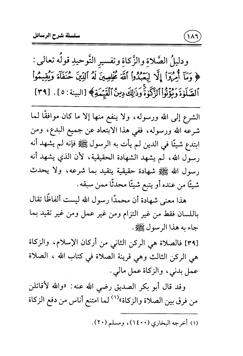 وَدَلِيلُ الصَّلاةِ وَالزَّكَاةِ وَتَفْسِيرُ التَّوْحِيدِ قَوْلُهُ تَعَالَى: {وَمَا أُمِرُوا إِلَّا لِيَعْبُدُوا اللَّهَ مُخْلِصِينَ لَهُ الدِّينَ حُنَفَاءَ وَيُقِيمُوا الصَّلَاةَ وَيُؤْتُوا الزَّكَاةَ وَذَلِكَ دِينُ الْقَيِّمَةِ} [البينة: 5] [39] .