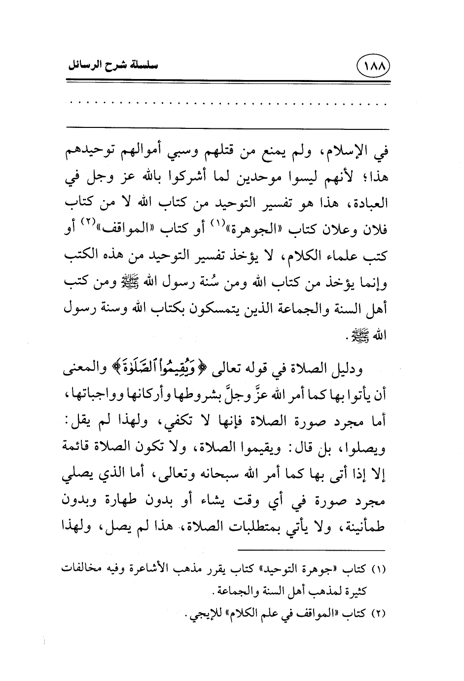 في الإسلام، ولم يمنع من قتلهم وسبي أموالهم توحيدهم هذا؛ لأنهم ليسوا موحدين لما أشركوا بالله عز وجل في العبادة، هذا هو تفسير التوحيد من كتاب الله لا من كتاب فلان وعلان كتاب "الجوهرة" أو كتاب "المواقف" أو كتب علماء الكلام، لا يؤخذ تفسير التوحيد من هذه الكتب وإنما يؤخذ من كتاب الله ومن سُنة رسول الله صلى الله عليه وسلم، ومن كتب أهل السنة والجماعة الذين يتمسكون بكتاب الله وسنة رسول الله صلى الله عليه وسلم.