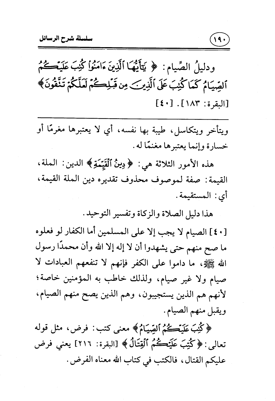 [40] الصيام لا يجب إلا على المسلمين أما الكفار لو فعلوه ما صح منهم حتى يشهدوا أن لا إله إلا الله وأن محمدًا رسول الله صلى الله عليه وسلم، ما داموا على الكفر فإنهم لا تنفعهم العبادات لا صيام ولا غير صيام، ولذلك خاطب به المؤمنين خاصة؛ لأنهم هم الذين يستجيبون، وهم الذين يصح منهم الصيام، ويقبل منهم الصيام.