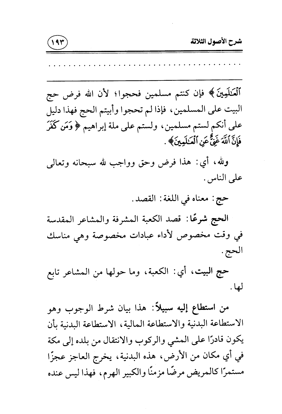 من استطاع إليه سبيلا: هذا بيان شرط الوجوب، وهو الاستطاعة البدنية والاستطاعة المالية، الاستطاعة البدنية بأن يكون قادرا على المشي والركوب والانتقال من بلده إلى مكة في أي مكان من الأرض، هذه البدنية، يخرج العاجز عجزا مستمرا كالمريض مرضا مزمنا والكبير الهرم، فهذا ليس عنده