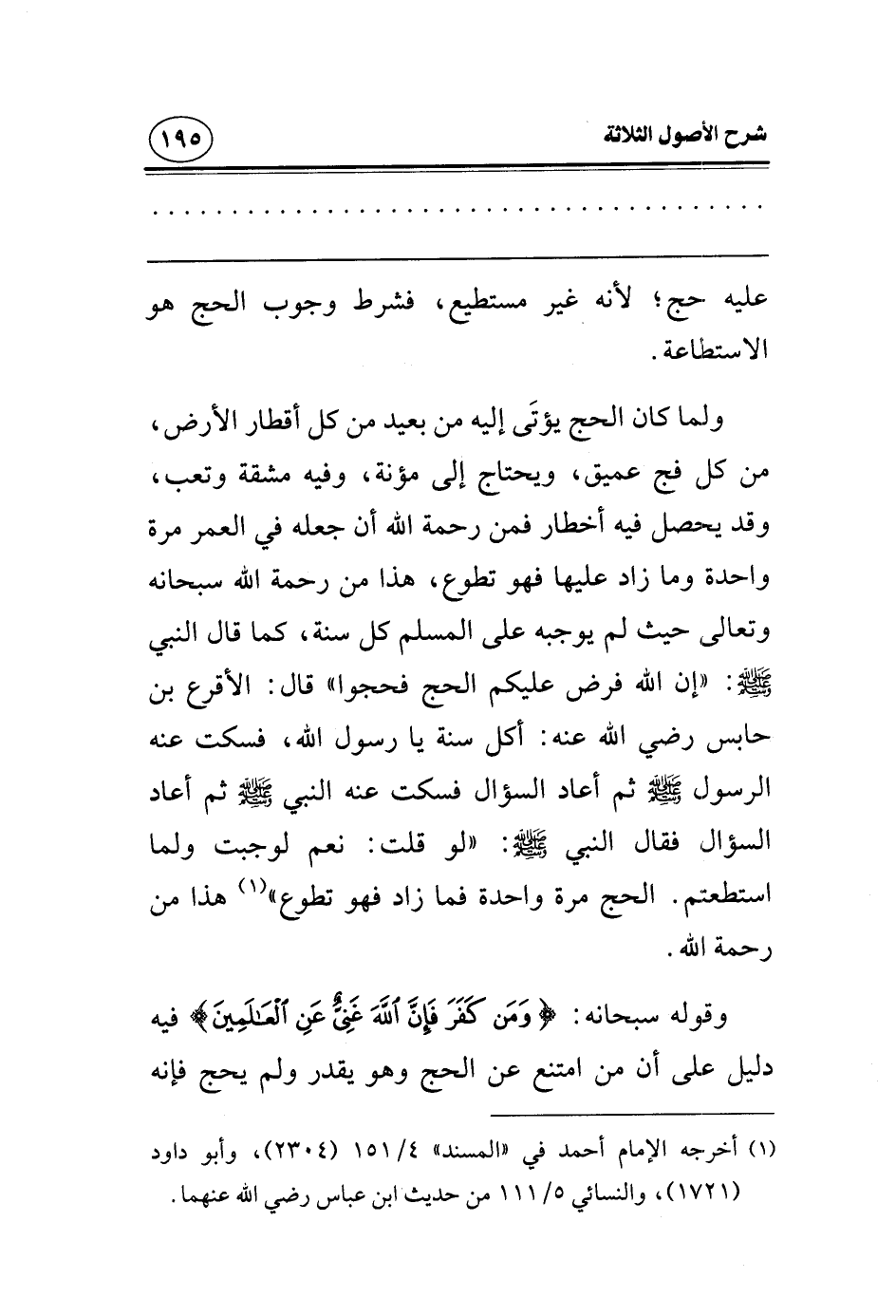 ولما كان الحج يؤتى إليه من بعيد من كل أقطار الأرض، من كل فج عميق، ويحتاج إلى مؤنة، وفيه مشقة وتعب، وقد يحصل فيه أخطار، فمن رحمة الله أن جعله في العمر مرة واحدة، وما زاد عليها فهو تطوع، هذا من رحمة الله سبحانه وتعالى حيث لم يوجبه على المسلم كل سنة، كما قال النبي صلى الله عليه وسلم: «إن الله فرض عليكم الحج فحجوا، قال الأقرع بن حابس رضي الله عنه: أكل سنة يا رسول الله؟ فسكت عنه الرسول صلى الله عليه وسلم، ثم أعاد السؤال، فسكت عنه النبي صلى الله عليه وسلم، ثم أعاد السؤال، فقال النبي صلى الله عليه وسلم: لو قلت نعم لوجبت، ولما استطعتم، الحج مرة واحدة، فما زاد فهو تطوع» ، هذا من رحمة الله.