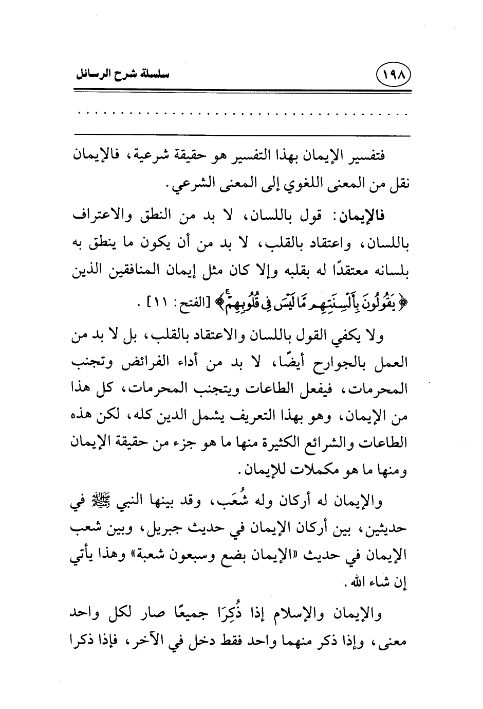 ولا يكفي القول باللسان والاعتقاد بالقلب، بل لا بد من العمل بالجوارح أيضا، لا بد من أداء الفرائض، وتجنب المحرمات، فيفعل الطاعات، ويتجنب المحرمات، كل هذا من الإيمان، وهو بهذا التعريف يشمل الدين كله، لكن هذه الطاعات والشرائع الكثيرة منها ما هو جزء من حقيقة الإيمان للإيمان، ومنها ما هو مكملات للإيمان.