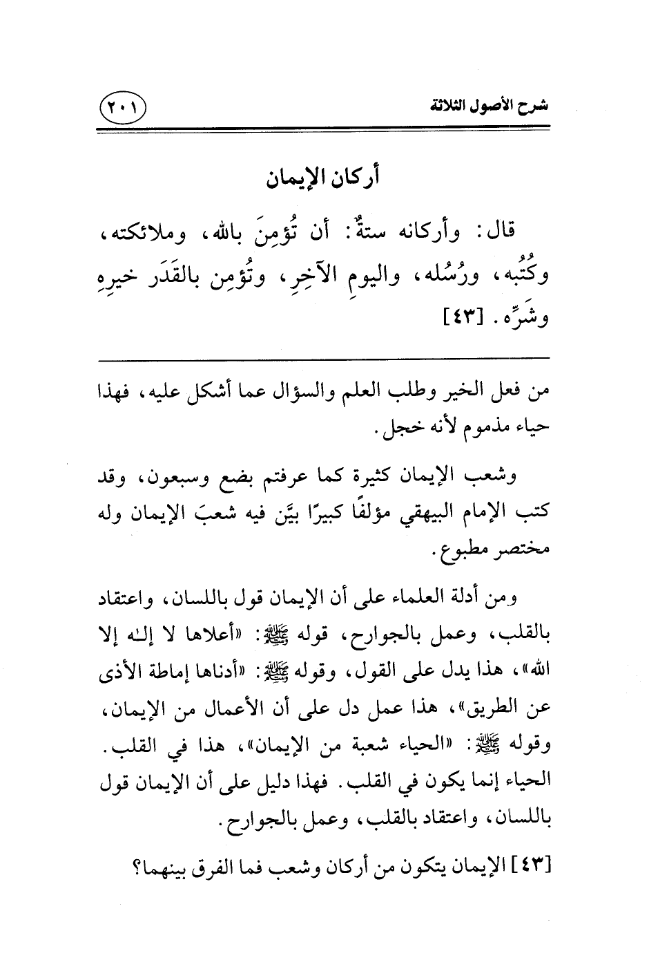 ومن أدلة العلماء على أن الإيمان قول باللسان، واعتقاد بالقلب، وعمل بالجوارح، قوله صلى الله عليه وسلم: «أعلاها لا إله إلا الله» ، هذا يدل على القول، وقوله صلى الله عليه وسلم: «أدناها إماطة الأذى عن الطريق» ، هذا عمل دل على أن الأعمال من الإيمان، وقوله صلى الله عليه وسلم: «الحياء شعبة من الإيمان» ، هذا في القلب، الحياء إنما يكون في القلب، فهذا دليل على أن الإيمان قول باللسان، واعتقاد بالقلب، وعمل بالجوارح.