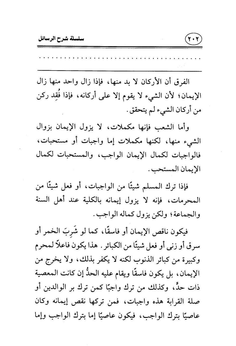 فإذا ترك المسلم شيئا من الواجبات، أو فعل شيئا من المحرمات، فإنه لا يزول إيمانه بالكلية عند أهل السنة والجماعة، ولكن يزول كماله الواجب، فيكون ناقص الإيمان أو فاسقا، كما لو شرب الخمر أو سرق أو زنى، أو فعل شيئا من الكبائر، هذا يكون فاعلا لمحرم وكبيرة من كبائر الذنوب، لكنه لا يكفر بذلك، ولا يخرج من الإيمان، بل يكون فاسقا، ويقام عليه الحد إن كانت المعصية ذات حد، وكذلك من ترك واجبا، كمن ترك بر الوالدين، أو صلة القرابة، هذه واجبات، فمن تركها نقص إيمانه، وكان عاصيا بترك الواجب، فيكون عاصيا إما بترك الواجب، وإما