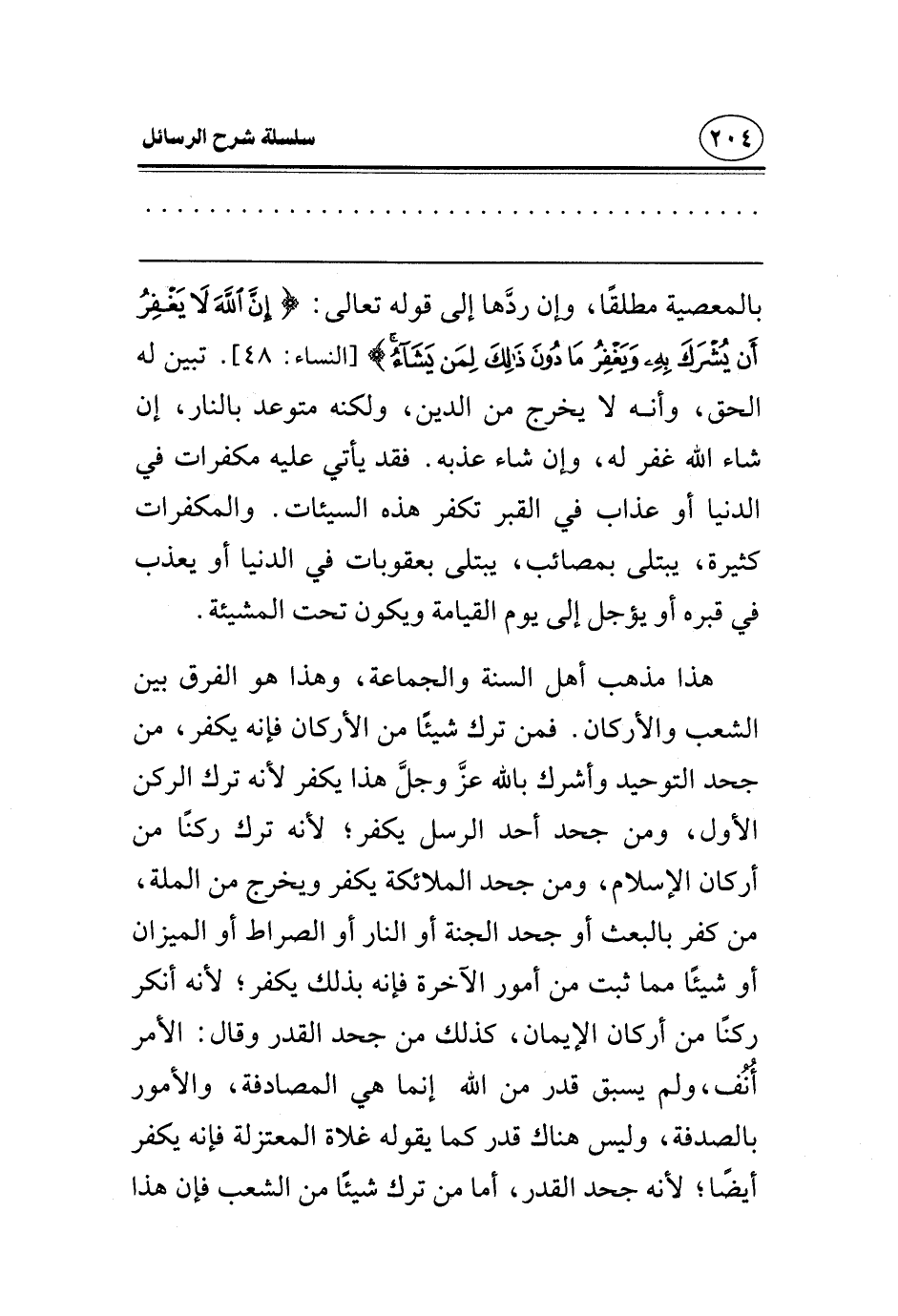 هذا مذهب أهل السنة والجماعة، وهذا هو الفرق بين الشعب والأركان، فمن ترك شيئا من الأركان فإنه يكفر، من جحد التوحيد وأشرك بالله عز وجل هذا يكفر؛ لأنه ترك الركن الأول، ومن جحد أحد الرسل يكفر؛ لأنه ترك ركنا من أركان الإسلام، ومن جحد الملائكة يكفر ويخرج من الملة، ومن كفر بالبعث، أو جحد الجنة أو النار أو الصراط أو الميزان، أو شيئا مما ثبت من أمور الآخرة، فإنه بذلك يكفر؛ لأنه أنكر ركنا من أركان الإيمان، كذلك من جحد القدر وقال: الأمر أنف، ولم يسبق قدر من الله، إنما هي المصادفة، والأمور بالصدفة، وليس هناك قدر، كما يقوله غلاة المعتزلة، فإنه يكفر أيضا؛ لأنه جحد القدر، أما من ترك شيئا من الشعب فإن هذا