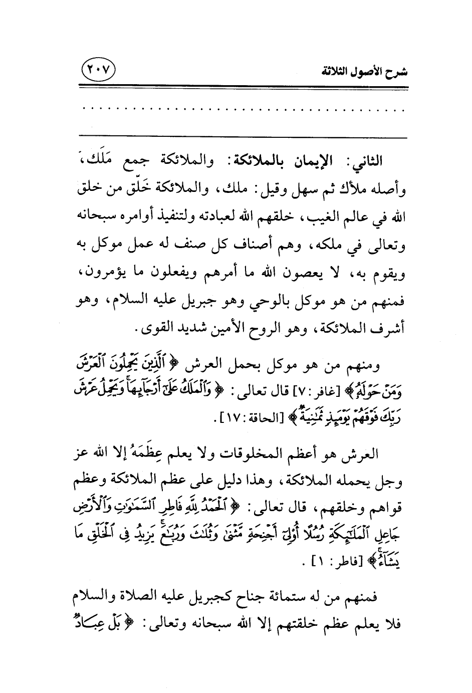 الثاني: الإيمان بالملائكة: والملائكة جمع ملك، وأصله ملأك ثم سهل وقيل: ملك، والملائكة خلق من خلق الله في عالم الغيب، خلقهم الله لعبادته، ولتنفيذ أوامره سبحانه وتعالى في ملكه، وهم أصناف، كل صنف له عمل موكل به ويقوم به، لا يعصون الله ما أمرهم، ويفعلون ما يؤمرون، فمنهم من هو موكل بالوحي، وهو جبريل عليه السلام، وهو أشرف الملائكة، وهو الروح الأمين، شديد القوي، ومنهم من هو موكل بحمل العرش {الَّذِينَ يَحْمِلُونَ الْعَرْشَ وَمَنْ حَوْلَهُ} [غافر: 7] ، قال تعالى: {وَالْمَلَكُ عَلَى أَرْجَائِهَا وَيَحْمِلُ عَرْشَ رَبِّكَ فَوْقَهُمْ يَوْمَئِذٍ ثَمَانِيَةٌ} [الحاقة: 17] .