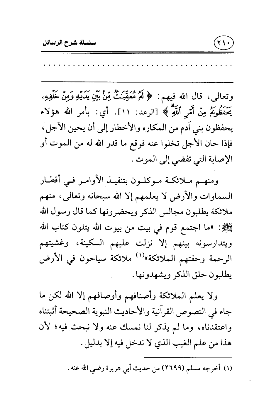 وتعالى، قال الله فيهم: {لَهُ مُعَقِّبَاتٌ مِنْ بَيْنِ يَدَيْهِ وَمِنْ خَلْفِهِ يَحْفَظُونَهُ مِنْ أَمْرِ اللَّهِ} [الرعد: 11] ، أي: بأمر الله هؤلاء يحفظون بني آدم من المكاره والأخطار إلى أن يحين الأجل، فإذا حان الأجل تخلوا عنه، فوقع ما قدر الله له من الموت أو الإصابة التي تفضي إلى الموت.