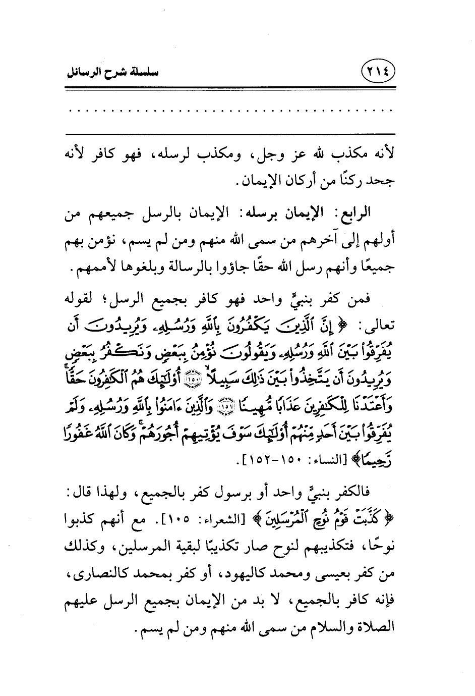 فالكفر بنبي واحد أو برسول كفر بالجميع، ولهذا قال: {كَذَّبَتْ قَوْمُ نُوحٍ الْمُرْسَلِينَ} [الشعراء: 105] ، مع أنهم كذبوا نوحا، فتكذيبهم لنوح صار تكذيبا لبقية المرسلين، وكذلك من كفر بعيسى ومحمد كاليهود، أو كفر بمحمد كالنصارى، فإنه كافر بالجميع، لا بد من الإيمان بجميع الرسل عليهم الصلاة والسلام، من سمى الله منهم ومن لم يسم.