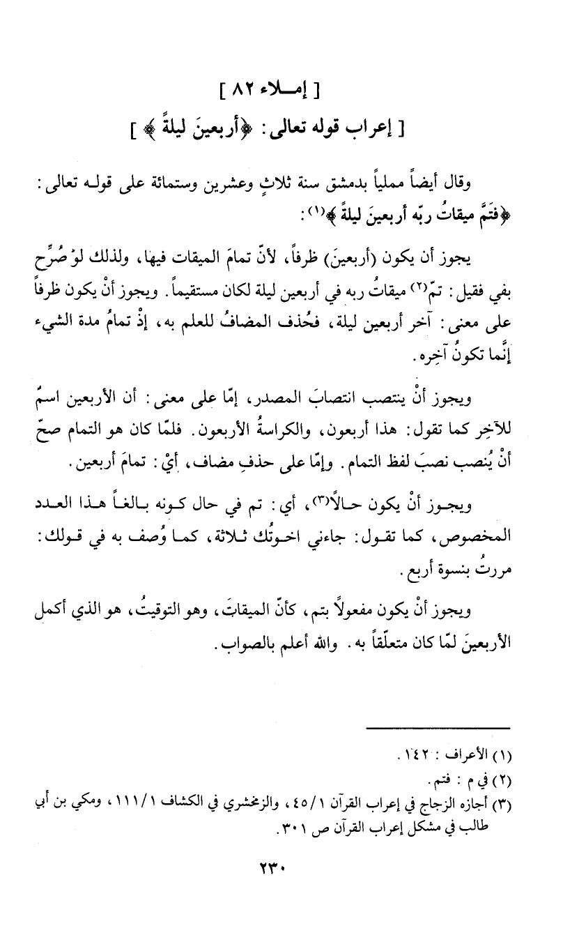 وقال أيضاً مملياً بدمشق سنة ثلاث وعشرين وستمائة على قوله تعالى: {فتم ميقات ربه أربعين ليلة} (¬1): يجوز أن يكون (أربعين) ظرفاً، لأن تمام الميقات فيها، ولذلك لو صرح بفي فقيل: تم (¬2) ميقات ربه في أربعين ليلة لكان مستقيماً. ويجوز أن يكون ظرفاً على معنى: آخر أربعين ليلة، فحذف المضاف للعلم به، إذ تمام مدة الشيء إنما تكون آخره. ويجوز أن ينتصب انتصاب المصدر، إما على معنى: أن الأربعين اسم للآخر كما تقول: هذا أربعون، والكراسة الأربعون. فلما كان هو التمام صح أن ينصب نصب لفظ التمام. وإما على حذف مضاف، أي: تمام أربعين.