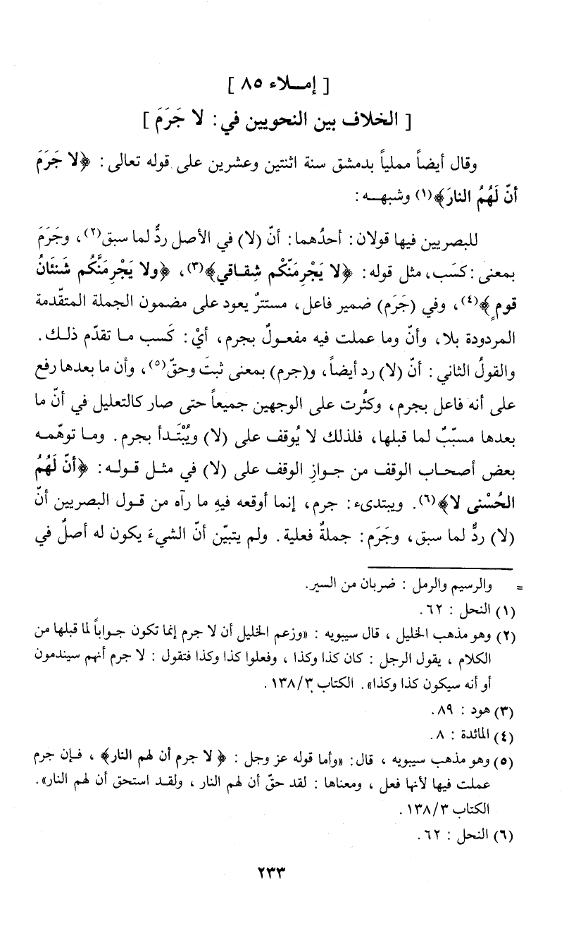 وقال أيضاً مملياً بدمشق سنة اثنتين وعشرين على قوله تعالى: {لا جرم أن لهم النار} (¬1) وشبهه: